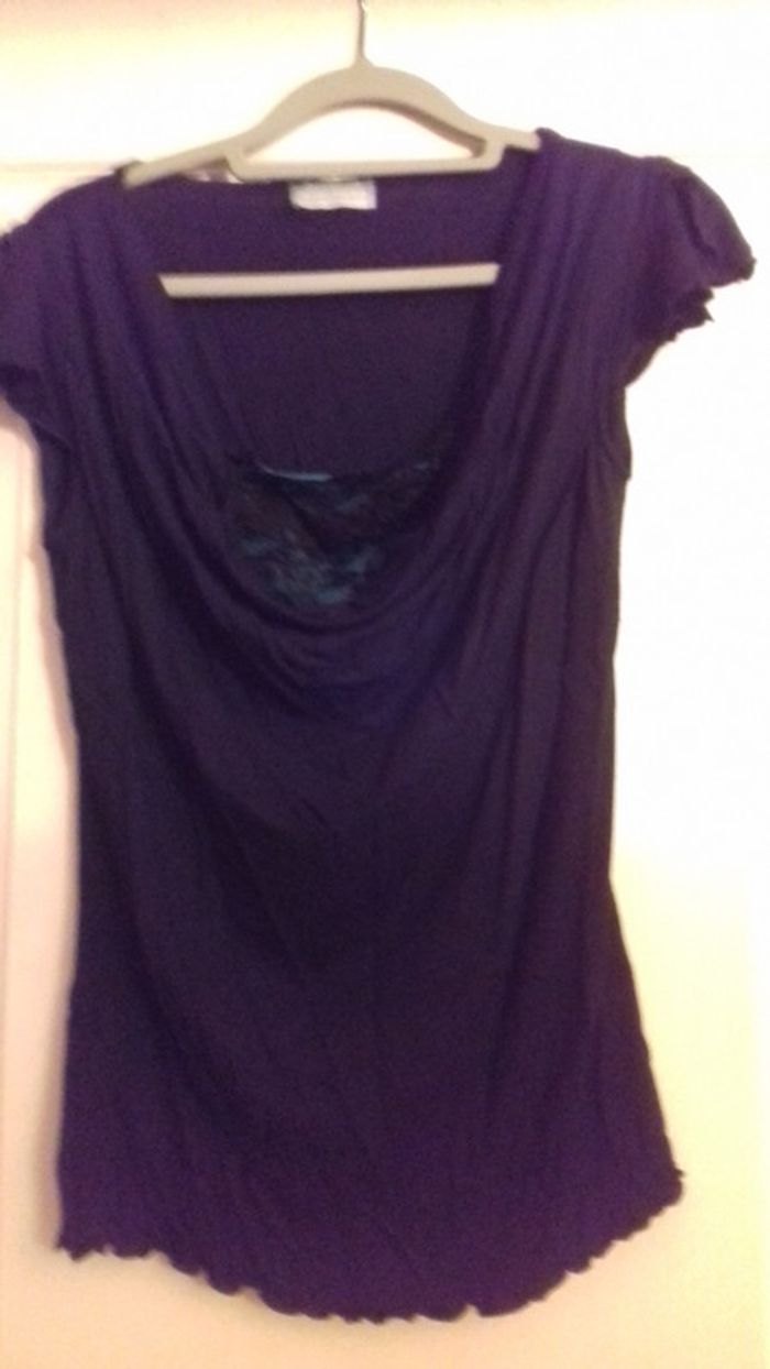 Joli haut noir avec empiècement dentelle sur fond turquoise, col bénitier, tout en féminité. Matière douce et extensible. Très bon état (peu porté).