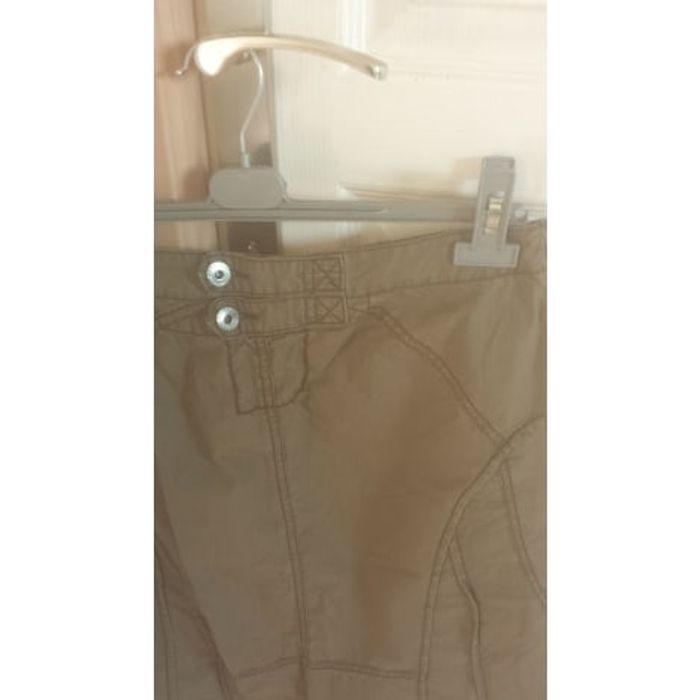 Jupe comme neuve de couleur kaki, longueur genoux (pour 1m60), coupe droite. 2 poches dont une qui se ferme. Passants pour ceinture. 100% coton. Taille 38