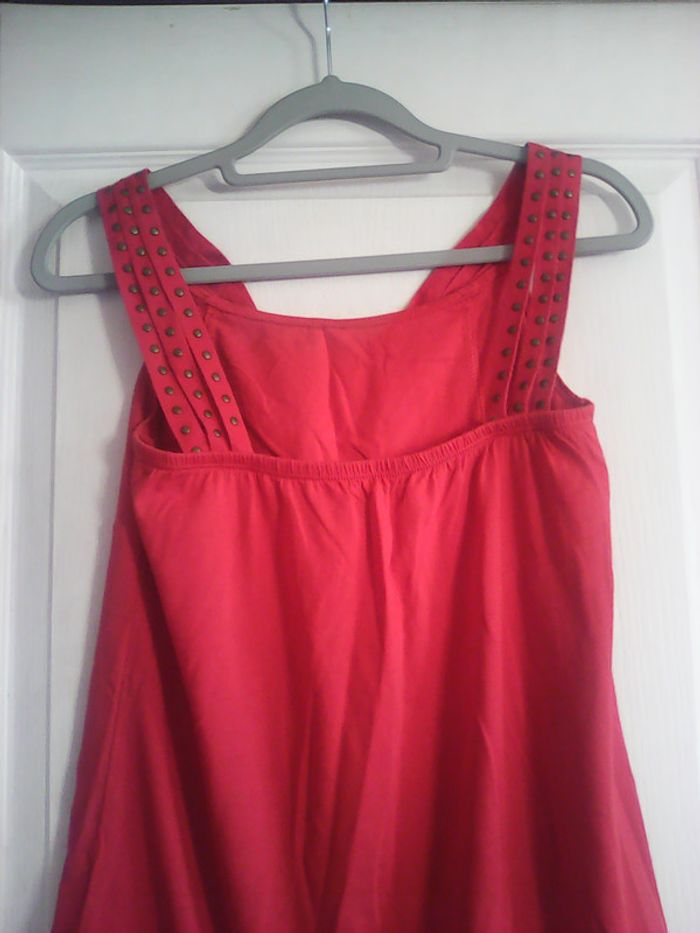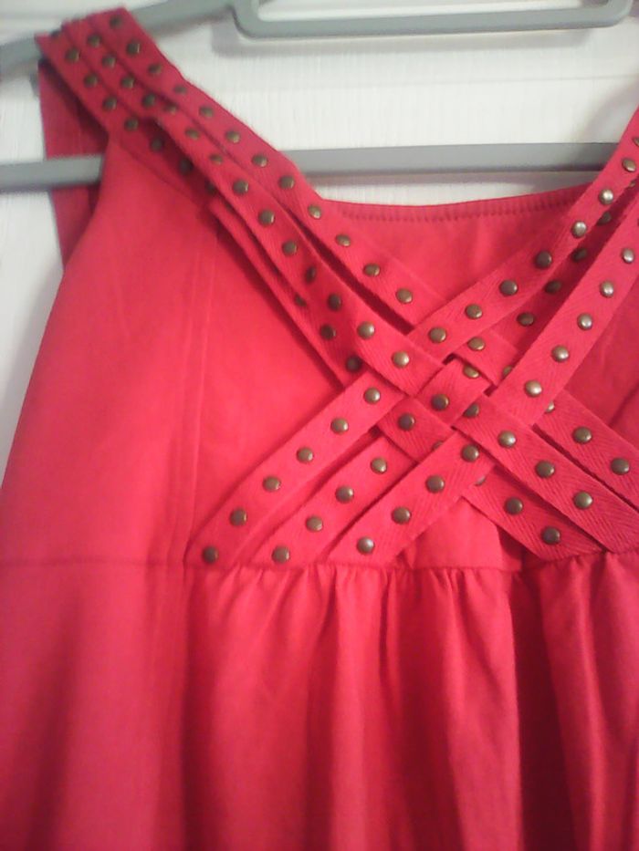 Joli top rouge avec lanières tissu croisées sur la poitrine, décorées de petits disques cuivrés. Elastiqué dans le dos. Matière douce, et extensible. Très bon état.