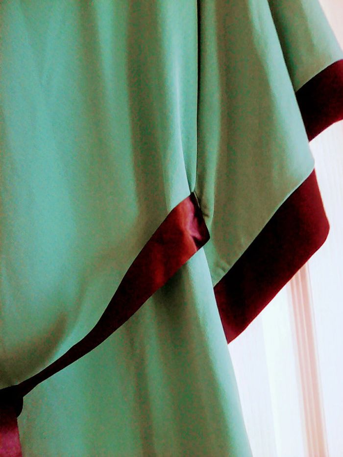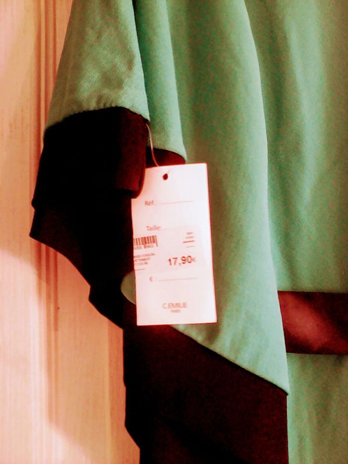 Haut d'un joli vert et à la coupe originale (,manches chauve-souris). Neuf avec étiquette. Bandes noires au col, manches et en bas. Fine ceinture satinée. Matière synthétique fluide. Taille unique idéale selon moi pour un 38_40.