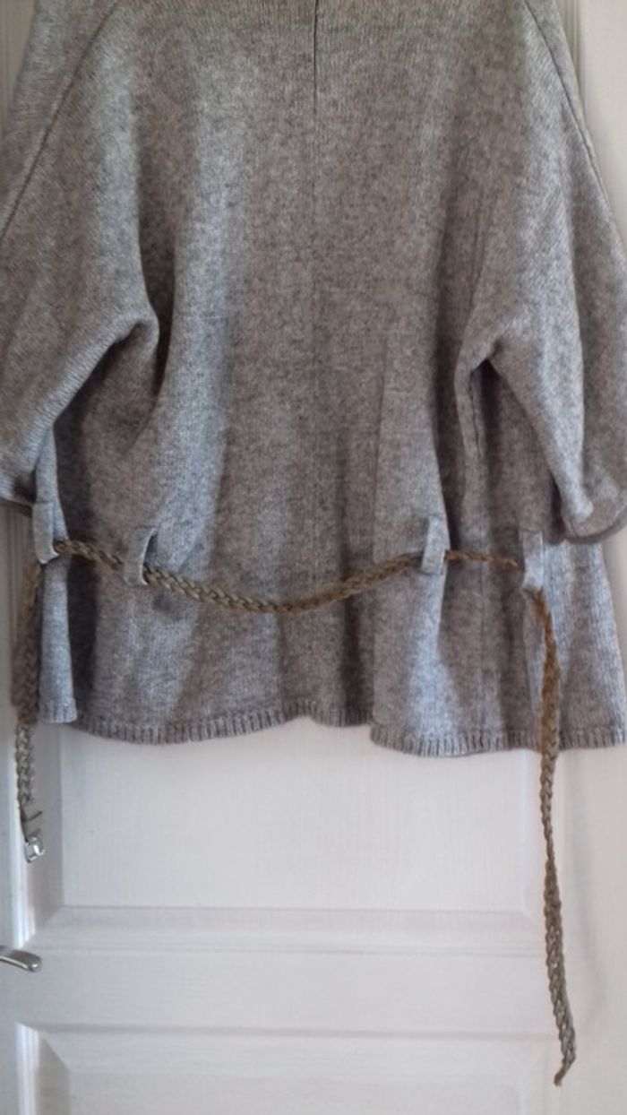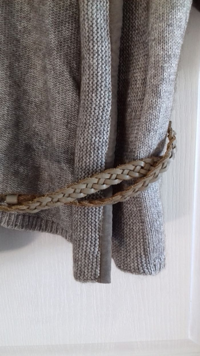 Grand gilet veste dans les tons taupe chiné. Ouvert (sans boutons) avec fine ceinture torsadée et grand col. Liseré aspect daim sur le col et les manches (3/4). Très sympa porté sur une robe style bohème et des bottes. Très bon état.