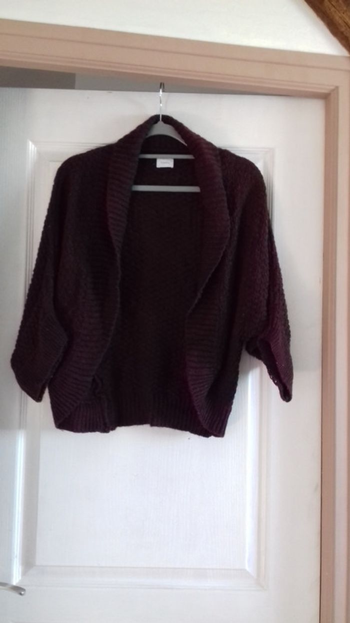 Gilet ouvert sans boutons, grenat, manches style chauve-souris. Grosse maille toute douce. Très bon état.