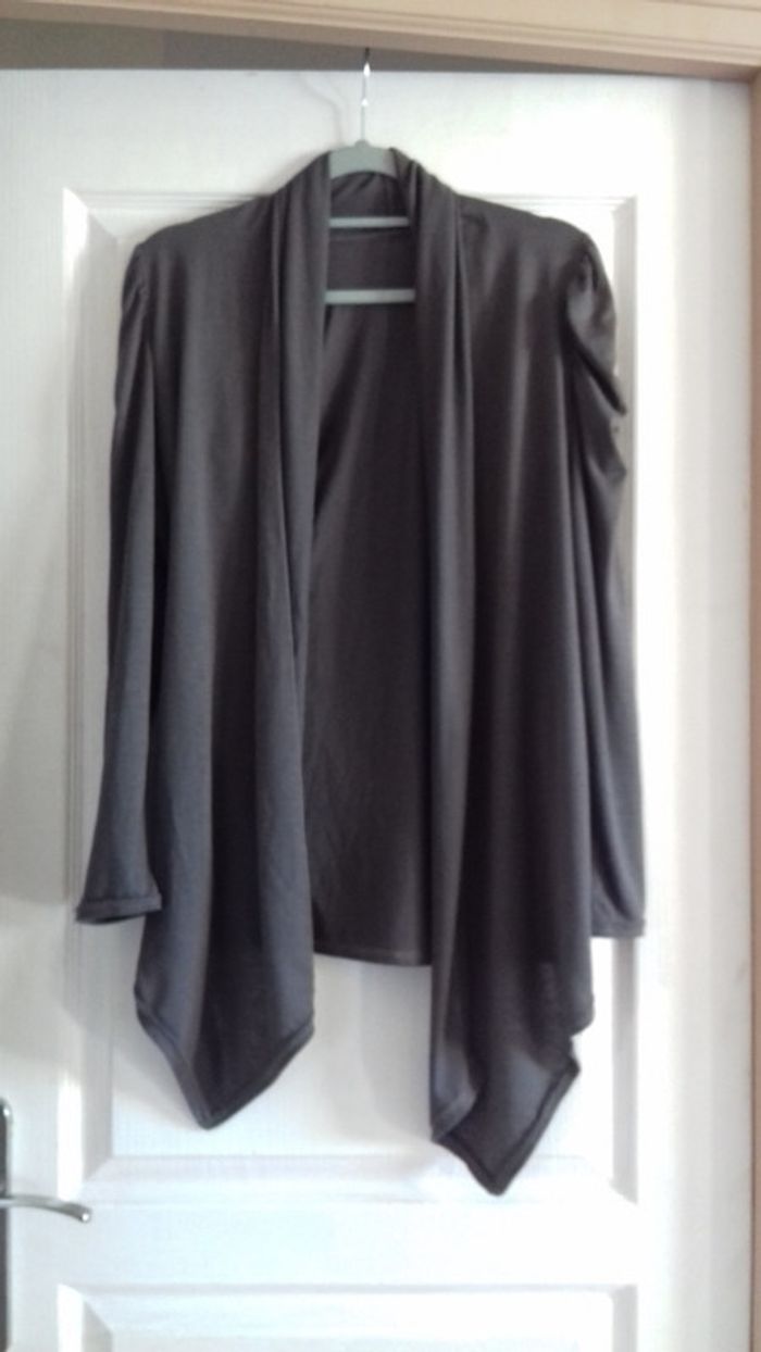 Gilet asymétrique fin en matière synthétique, avec épaules froncées. Gris anthracite. Elégant porté par dessus un caraco ou une robe. Taille unique, idéal pour un 38/40. Excellent état.