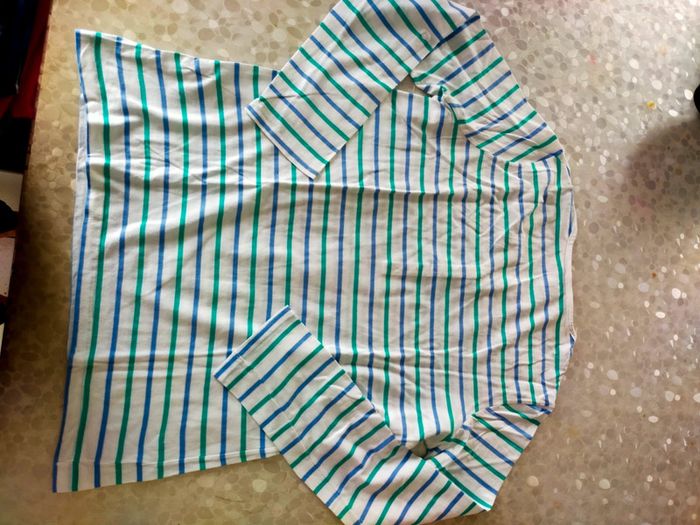 Sweat ou tee shirt manches longues femme blanc rayé vert et bleu manche qu on peut replier marque original couleur & prix . Excellente état libre de suite envoi possible à vos frais. Réduction en achat en lot. Autres annonces Zou251972 .