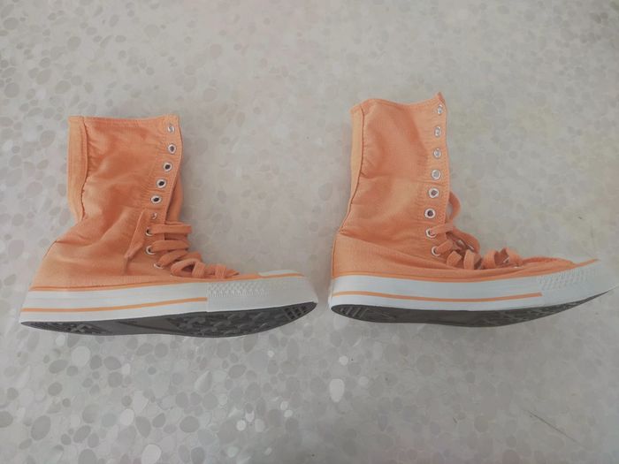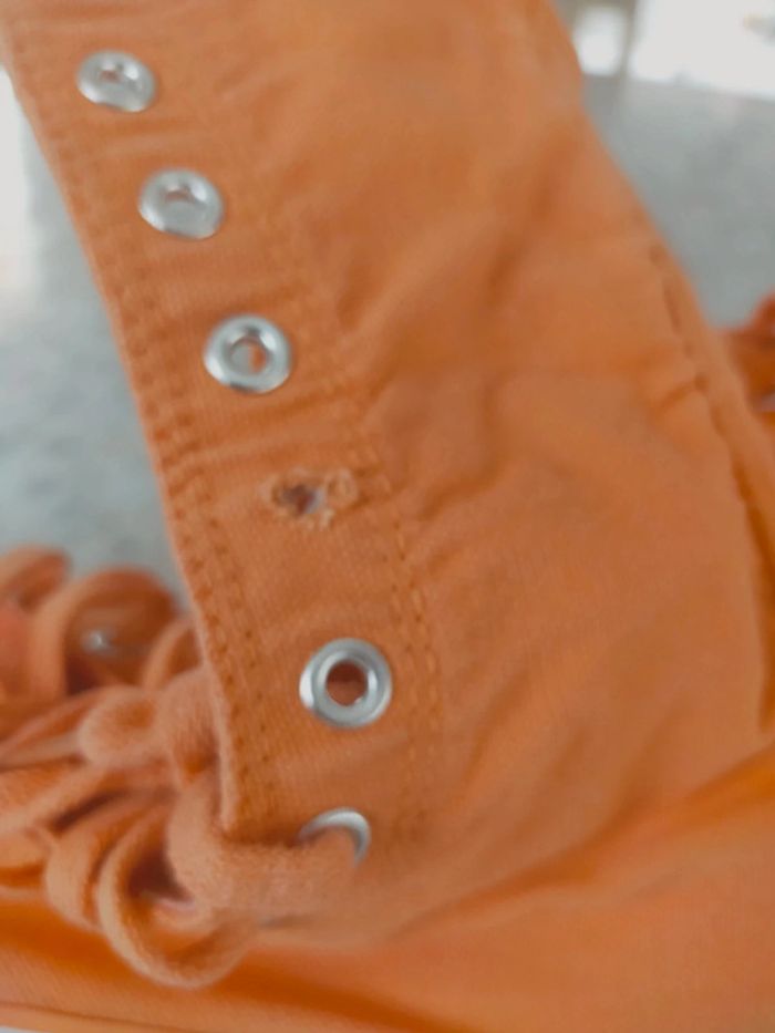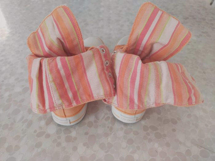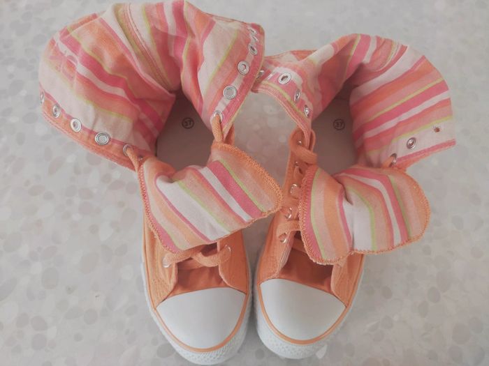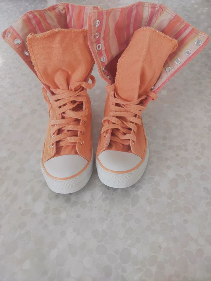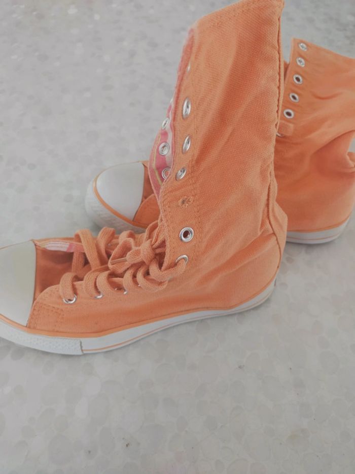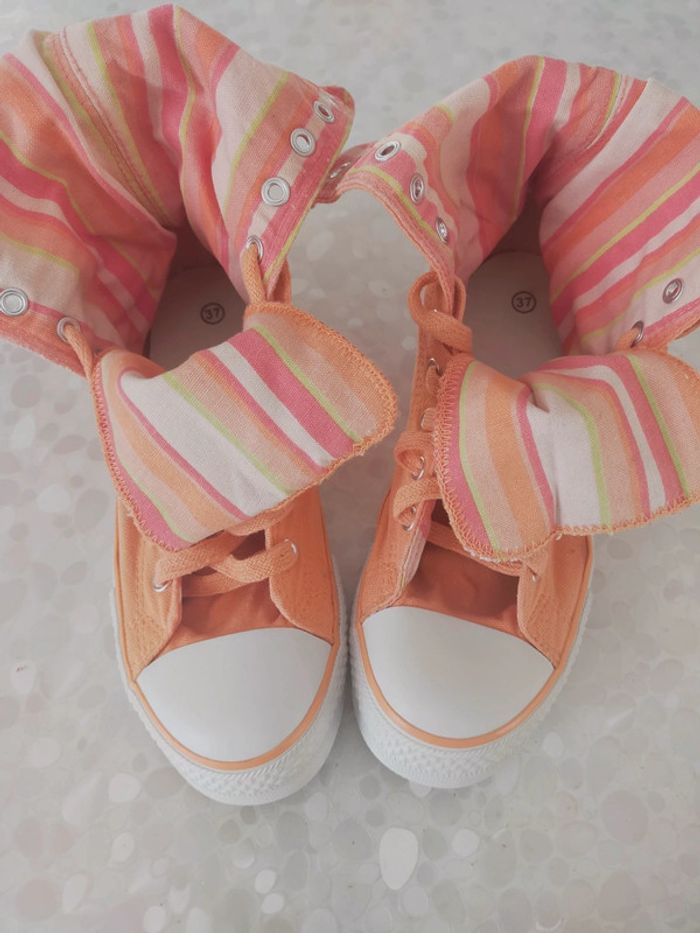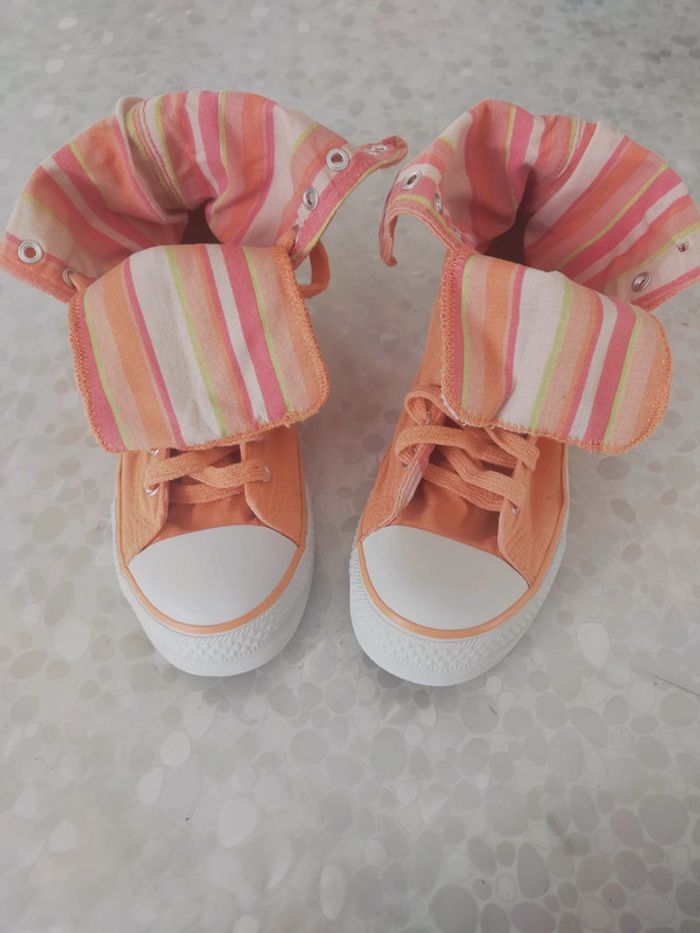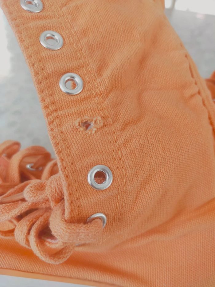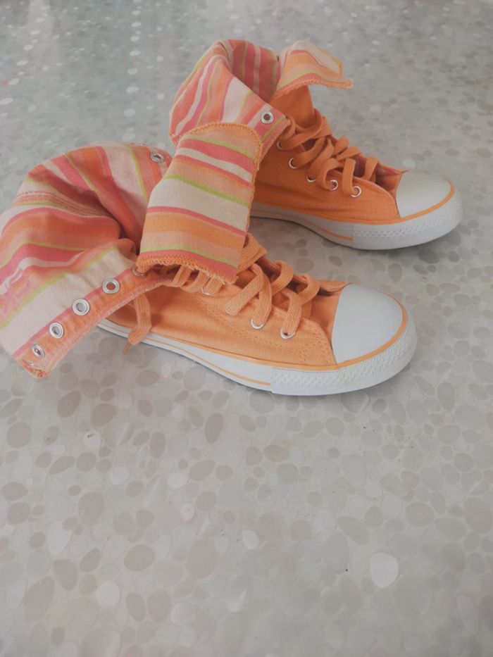 Baskets montantes femme en toile orange marque original Okaïdi taille 37. Doublure tissu rayé orange , abricot , rose.... Très confortable et couleur printanier. Neuves jamais portées . PT défaut manque 1 rivets mais ne gêne pas l usage chez le cordonnier 2 € maxi. Excellente état. Libre de suite. Envoi possible a vos frais. Autres annonces Zabou251972.