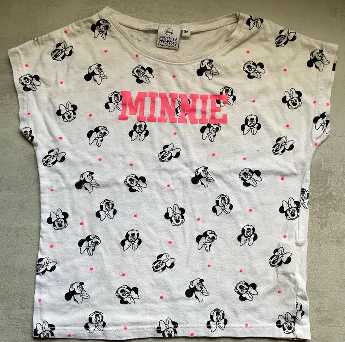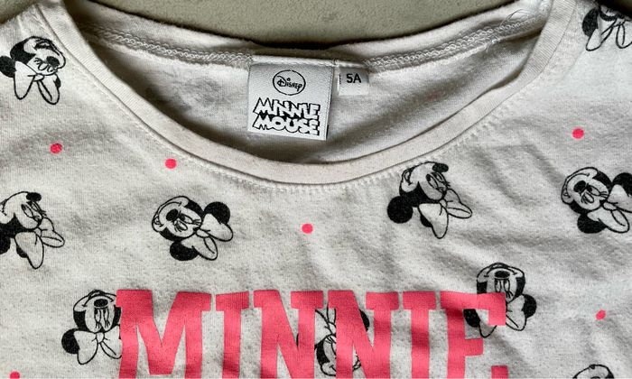 Tee shirt à manches courtes de la licence Minnie de Disney Taille 5 ans Présence de petites bouloches (voir photo) Occasion, bon état