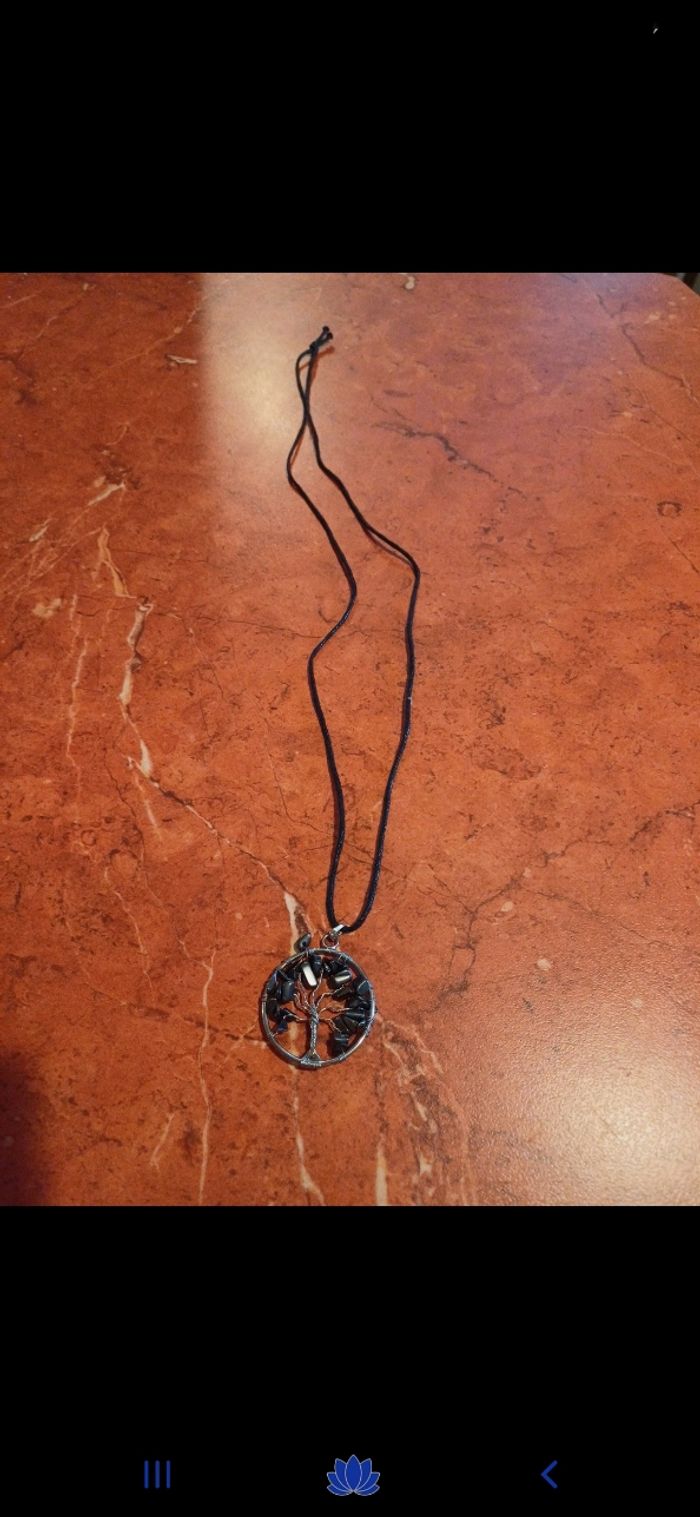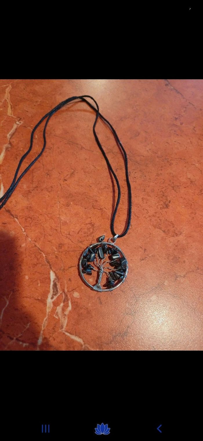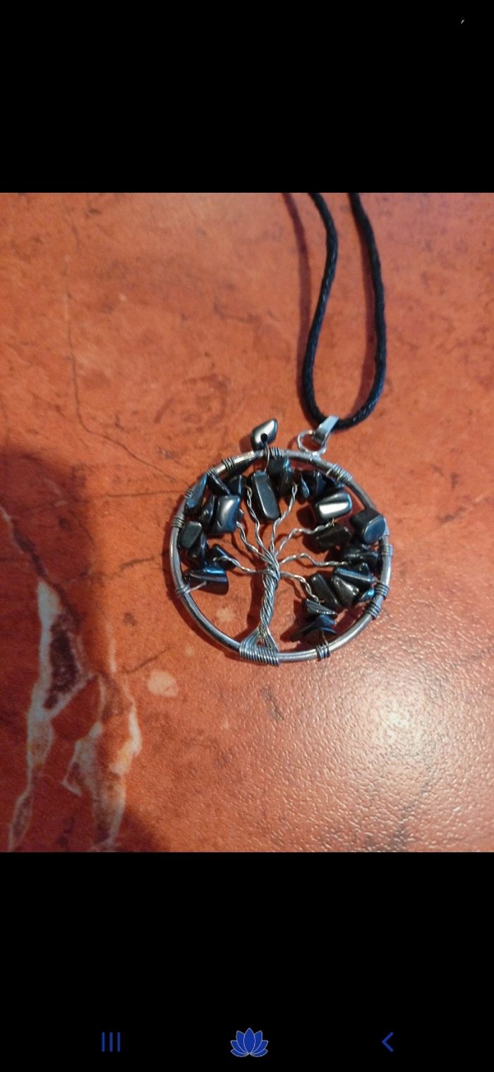 Collier avec pendentif arbre de vie en pierre naturelle : hématite. C est une pierre d harmonie avec des actions defatiguantes. Elle redonnerai courage et énergie et aurait un pouvoir destressant