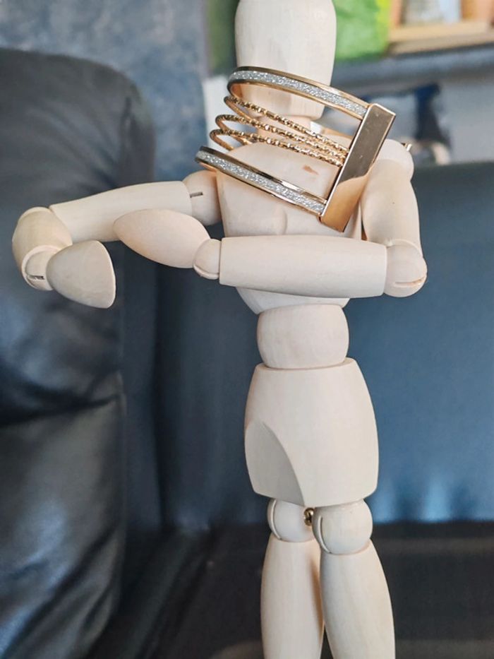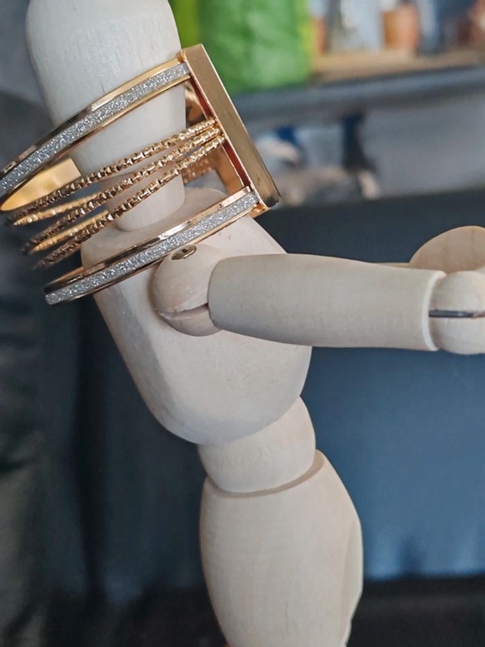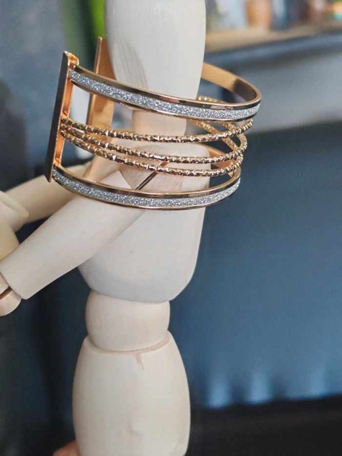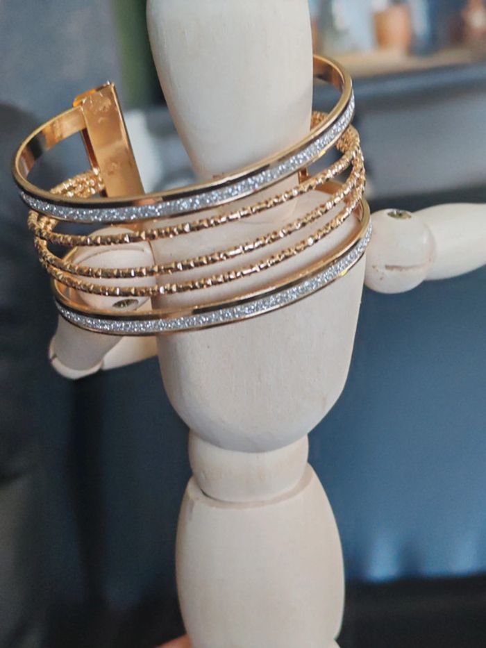 Bracelet manchette en cuivre Doré Strass Ouvert pour desserrer ou resserrer selon votre poignet 2 bandes de strass 3 lignes sur-piquées et torsadées