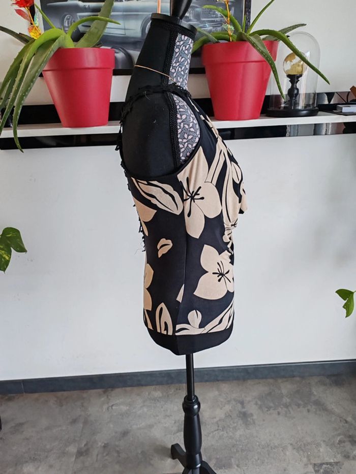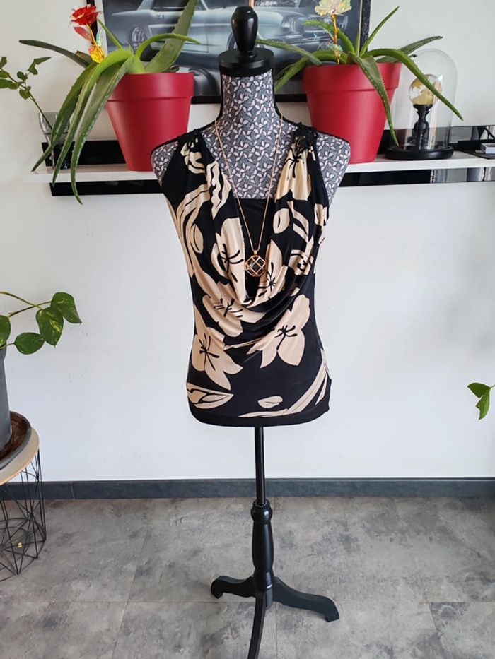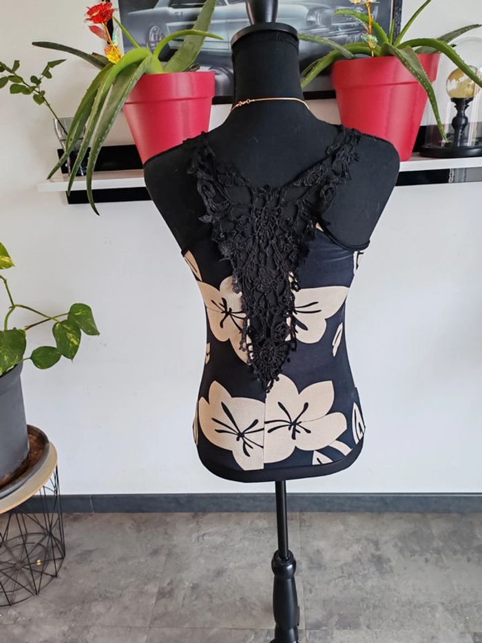 Très beau haut avec col drapé, la dentelle au niveau des bretelles et dans le dos. Près du corps Agréable à porter