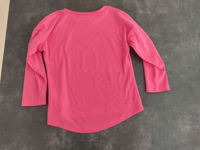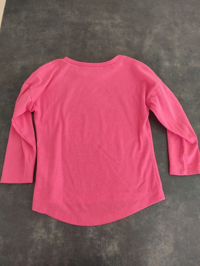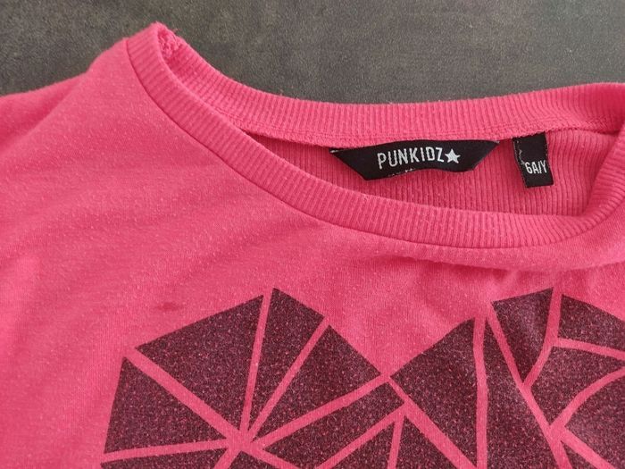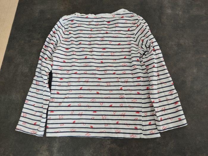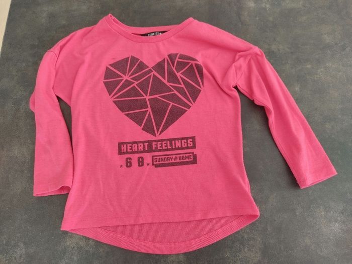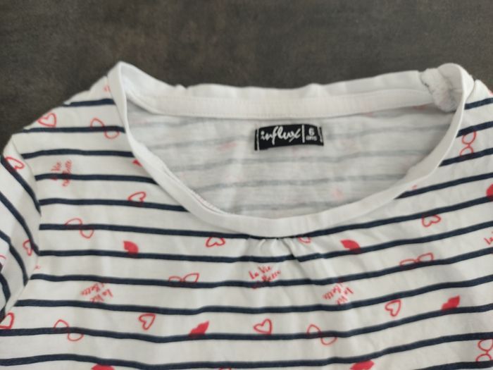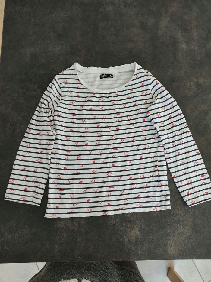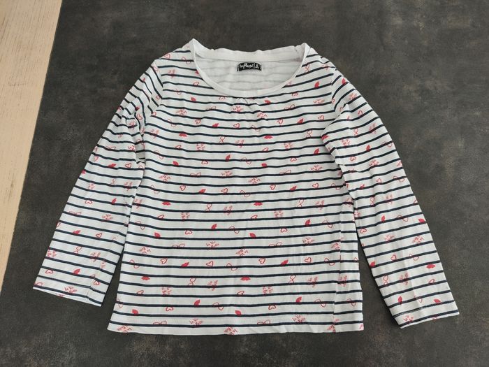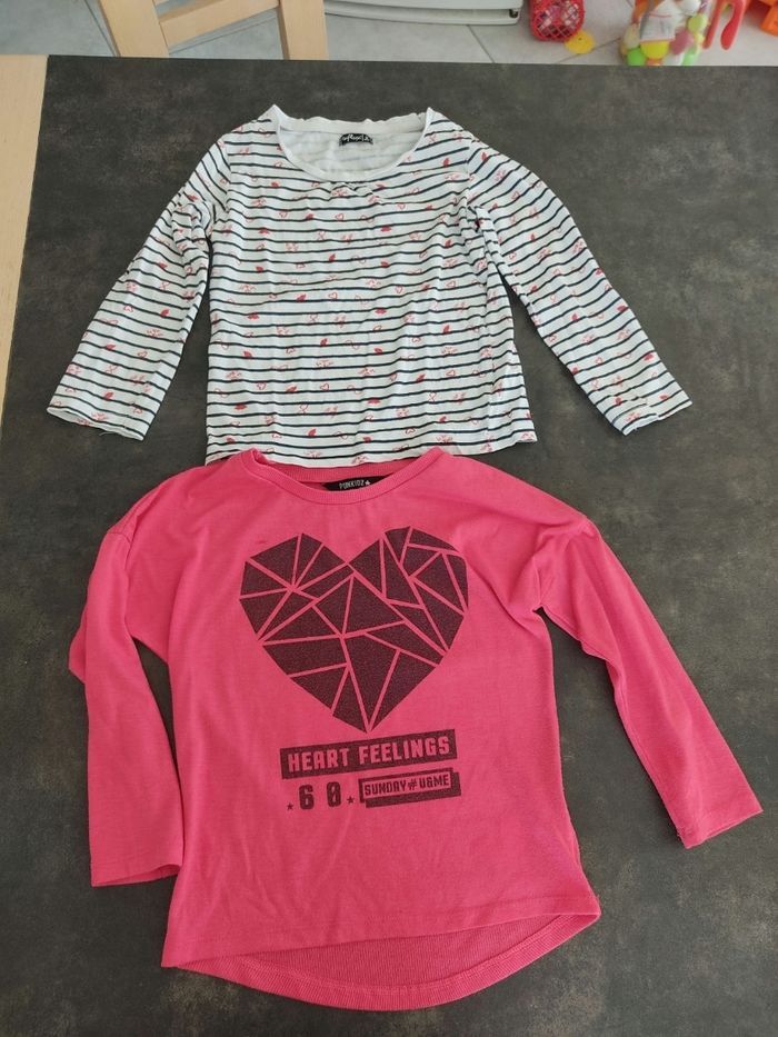 Lot de 2 Tee-shirt à manches longues pour fille de 6 ans 1) t-shirt rose motif coeur : marque punkids. 1 petite tâche en haut du coeur ( voir photo). Très souple. 80% polyester et 20% viscose 2) tee-shirt blanc rayé de bleu marine motif rouge coeur et inscription la vie est belle . Marque influx. Une petite tâche à la manche. ( Voir photo). 100%coton. 1,50€/pièce ou 2€ le lot de 2 .