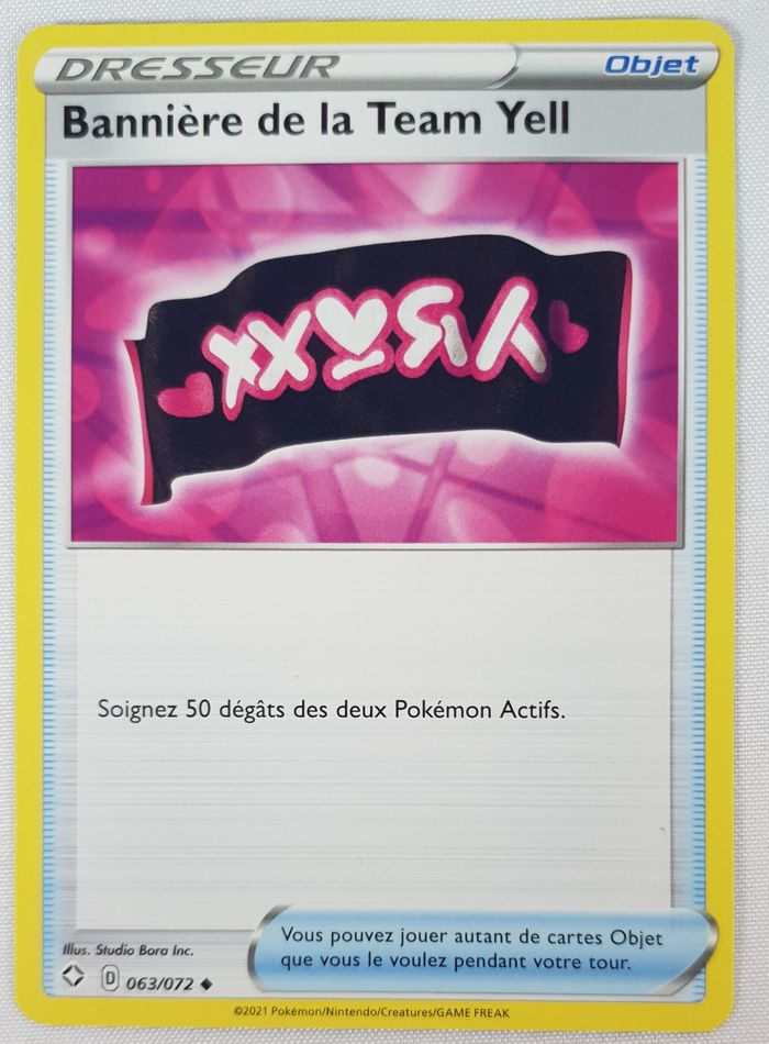 CARTE POKEMON BANNIERE DE LA TEAM YELL Etat: Neuf Sortie de Booster. (voir photos). Série: Destinées Radieuses - EB4.5 (Epée et Bouclier). Numéro: 063/072 ◆ La carte est envoyé sous sleeve par lettre bien protégée.