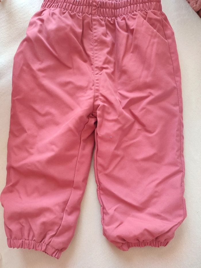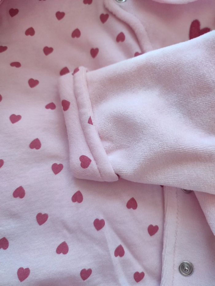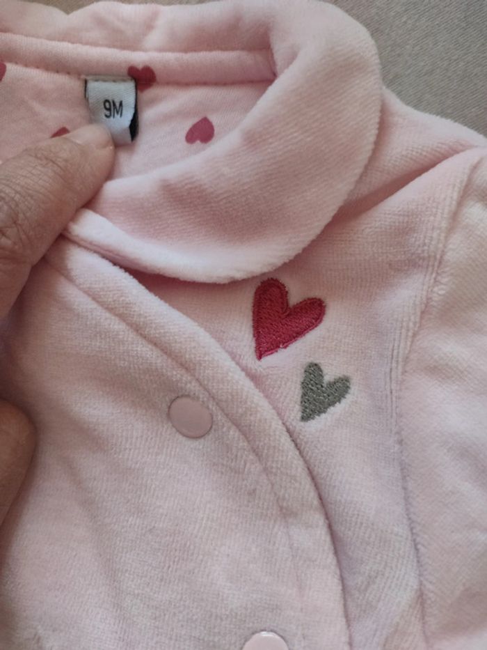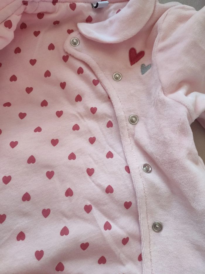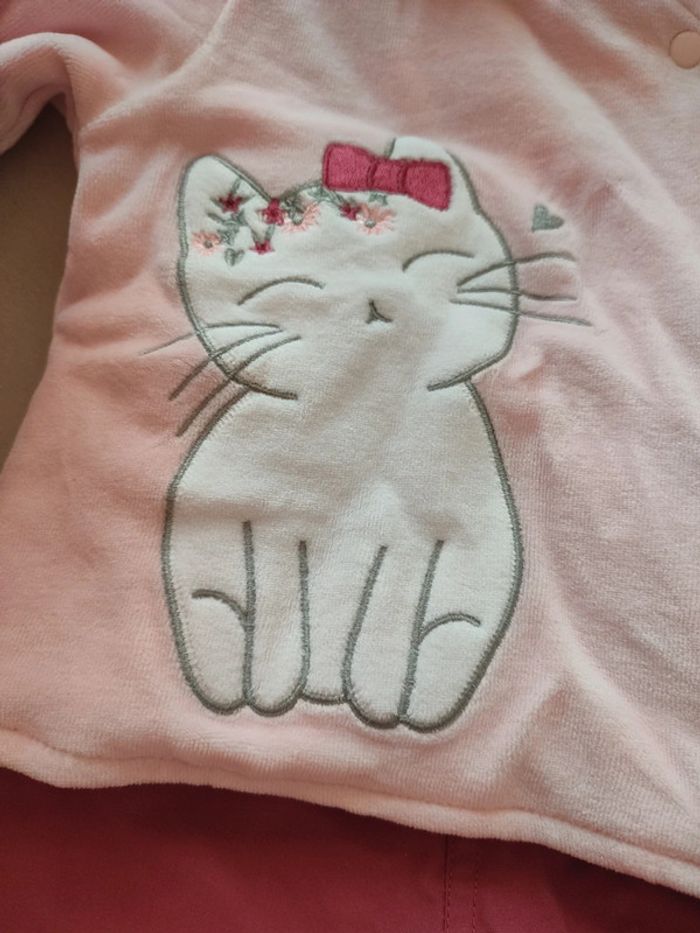Veste rose pâle très douce, à l'intérieur des cours en motif. Pantalon fushia. 9 mois