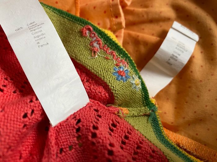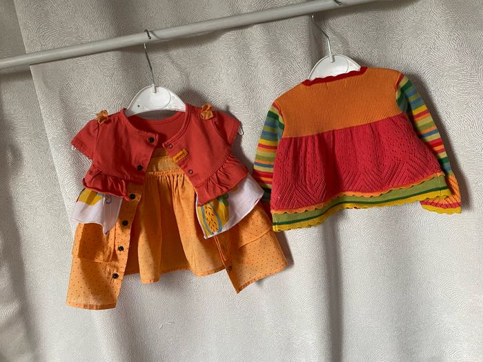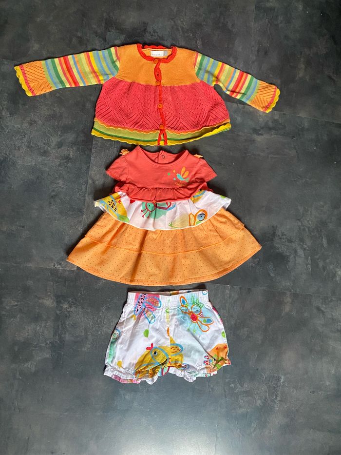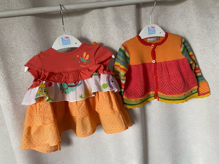 Ensemble robe gilet bloomer en parfait état Couleurs printanières blanc jaune orangé vert Taille 3 mois 59 cm 100% coton Catimini