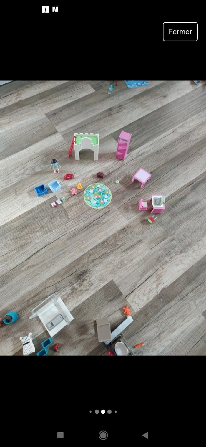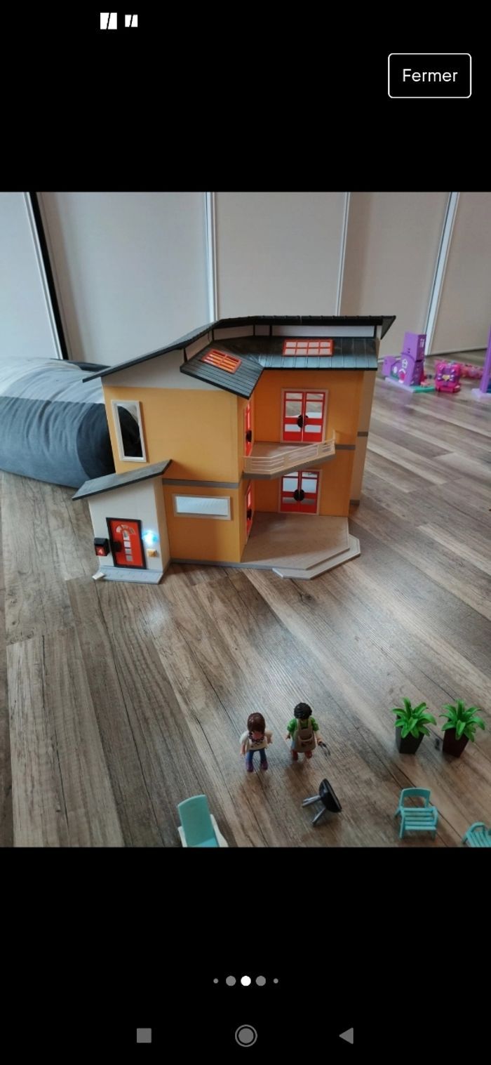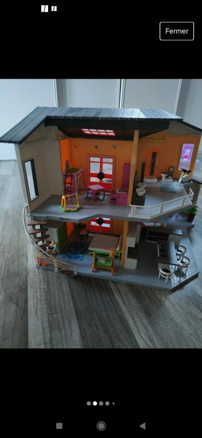 Vend la maison moderne Playmobil avec différentes pièces : cuisine aménagée, salon, salle de bain, chambre des parents, chambre enfant fille et chambre de bébé