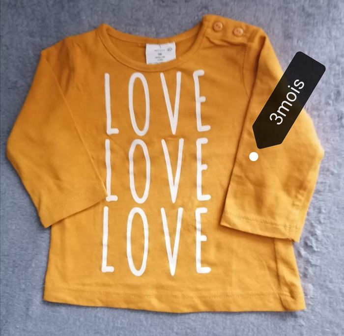 T. Shirts Manche longue Marque kiabi Age 3mois ( 56-62cm) Couleur : moutarde /blanc Matière tissus :léger Portée, aucune tache 2.50€
