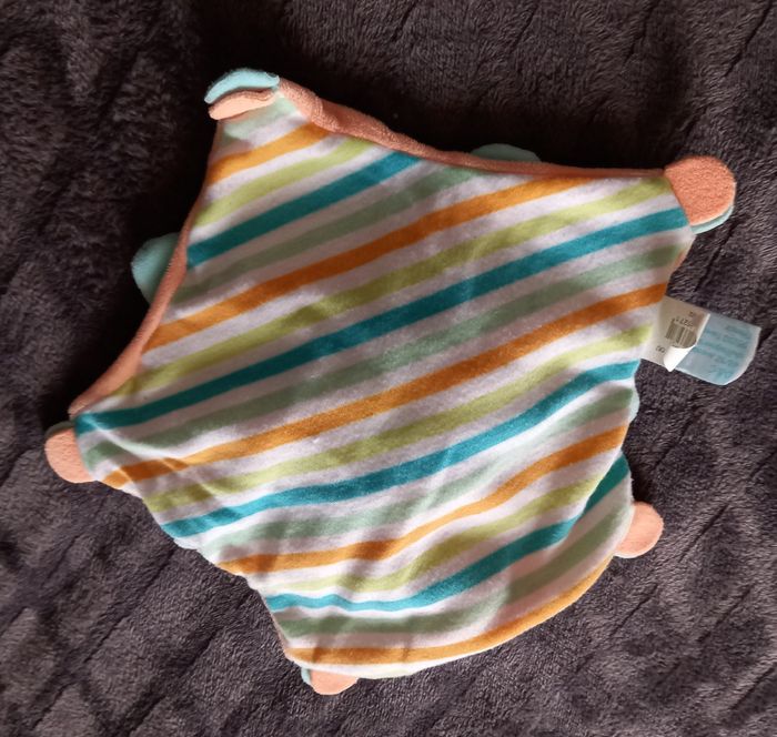 Doudou plat en forme d étoile et en velour de couleur orange et de l autre côté en tissu de couleur blanc rayés multicolores Par dessus une étoile en velours de couleur bleu clair Lapin Stello sur le milieu du doudou