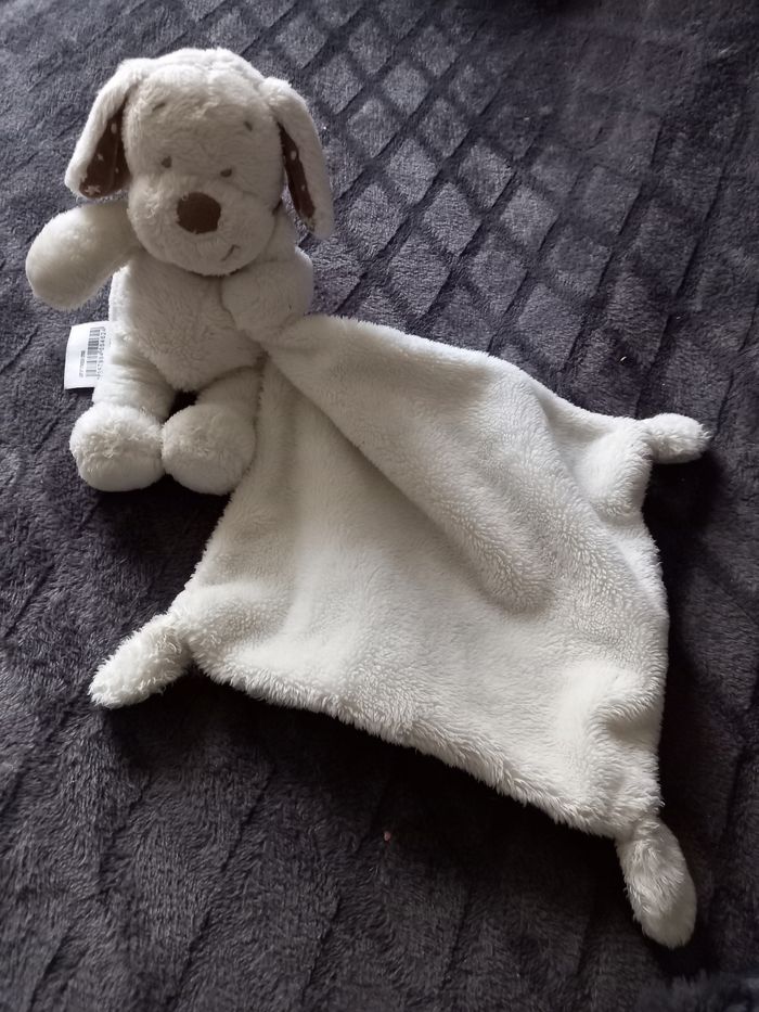 Doudou peluche chien en velours de couleur blanc Intérieur des oreilles et bandana autour de son cou en velours daim de couleur marron Tiens dans sa main un mouchoir en velours de couleur blanc avec une grande étoiles et petites brodées sur le mouchoir 3 nœuds