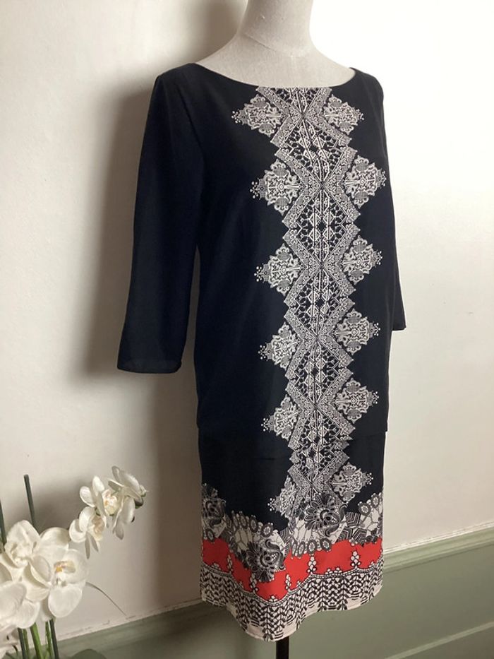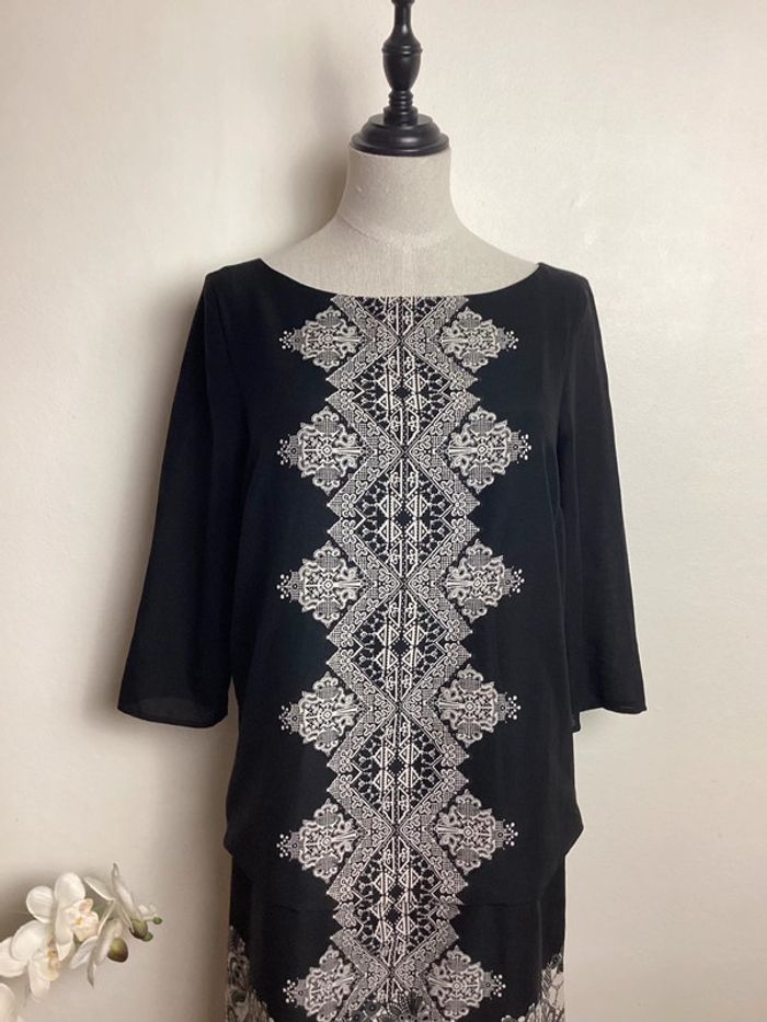 Robe fluide noire à motifs avec doublure Manches au niveau du coude légèrement transparentes Fermeture éclair dans le dos Largeur d’aisselle à aisselle: 42 cms Longueur totale: 86 cms #robefemme36 #femme36 #robecasual36 #robechic36 #robekookai36 #robeamotifs36 #robenoire36 #kookaifemme36 #kookai36 #robedroite36 #robefluide36 #carole1996 #teametco