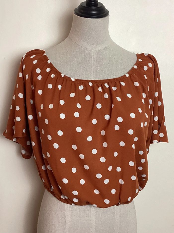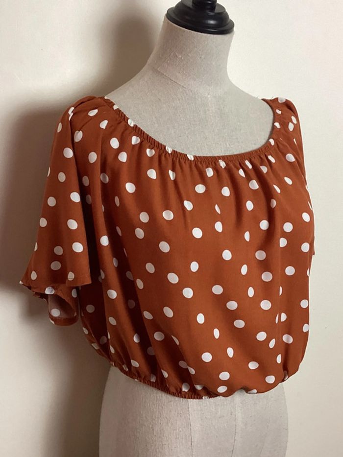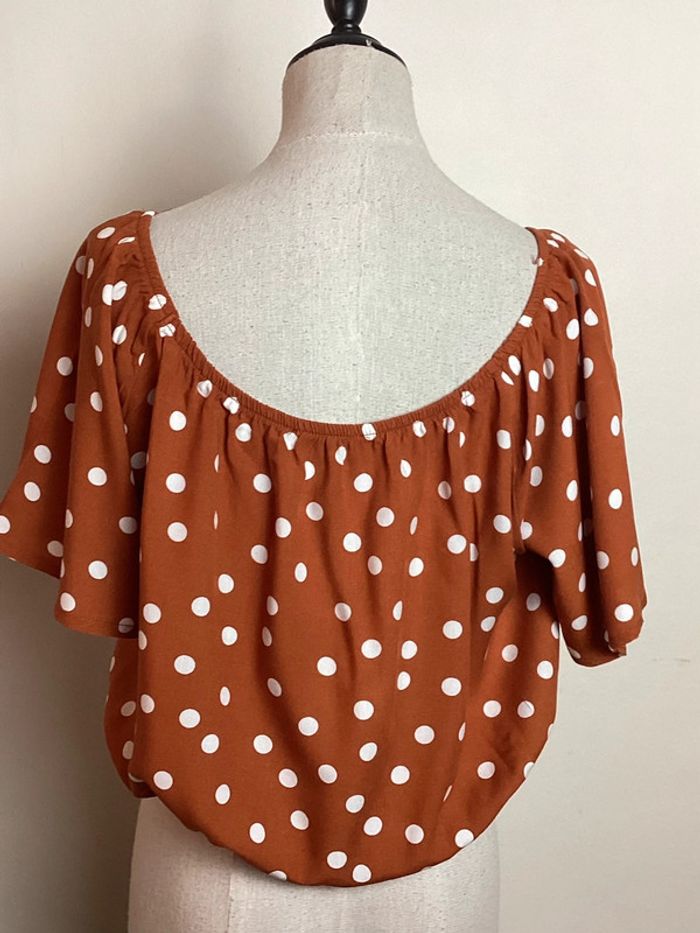 Croc Top orangé à pois blancs Col arrondi Largeur d’aisselle à aisselle: 44 cms Longueur totale: 43 cms #topamisu40 #hautfemme40 #femme40ete #étéfemme40 #femme40 #topapois40 #topfemme40 #top40 #toporange40 #amisu40 #hautfemme40 #carole1996 #teametco