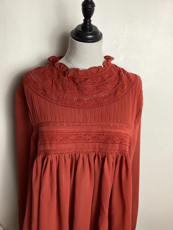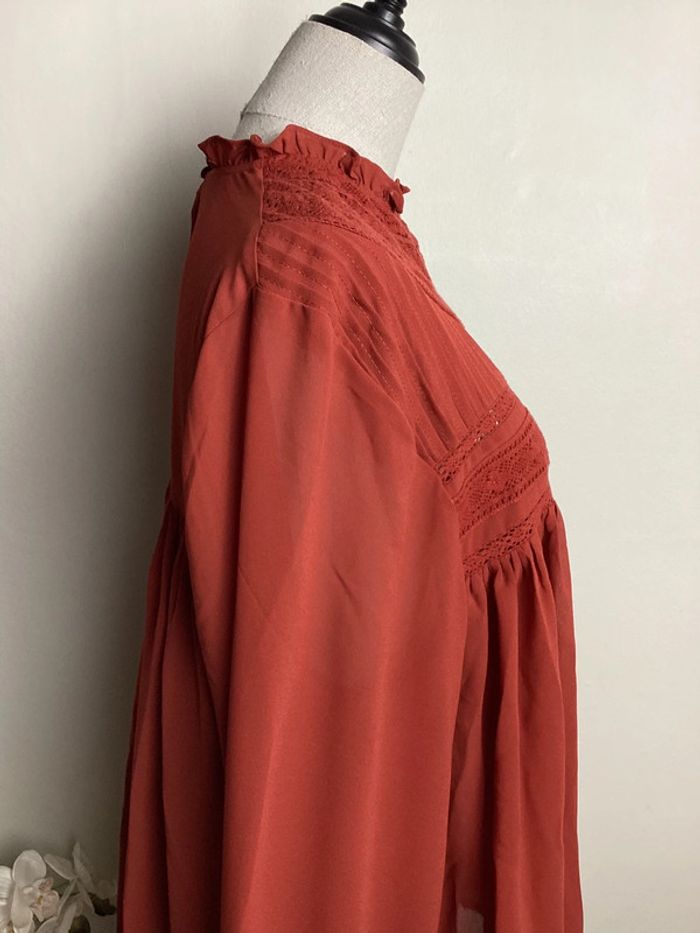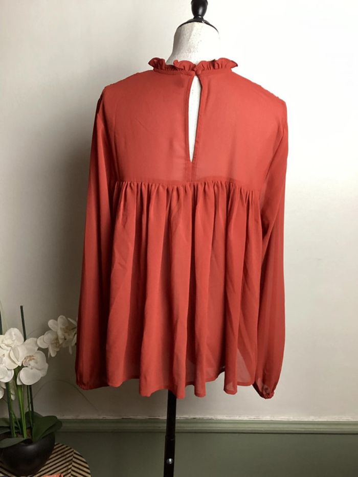 Blouse fluide de couleur rouille à manches longues Broderies et fronces Légèrement transparente Largeur d’aisselle à aisselle : 42 cms Longueur totale : 60 cms #blousefemme34 #hautfemme34 #femme34 #blousefluide34 #blouse34 #blousebrodée34 #blouseamisu34 #amisu34 #blouserouille34 #carole1996 #teametco