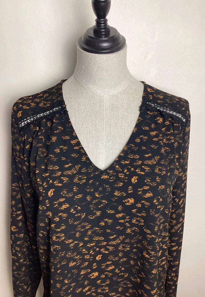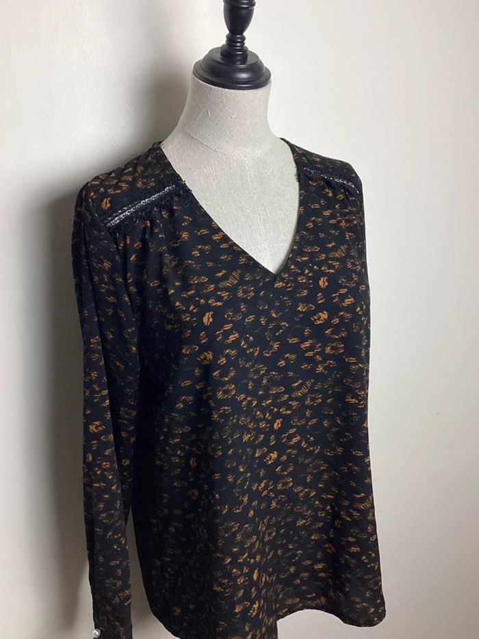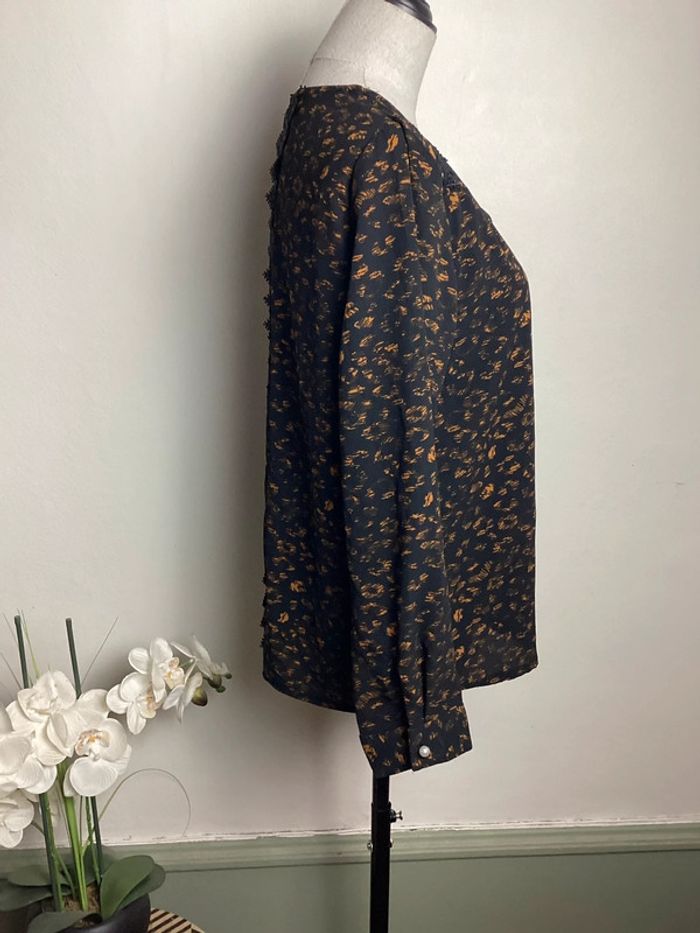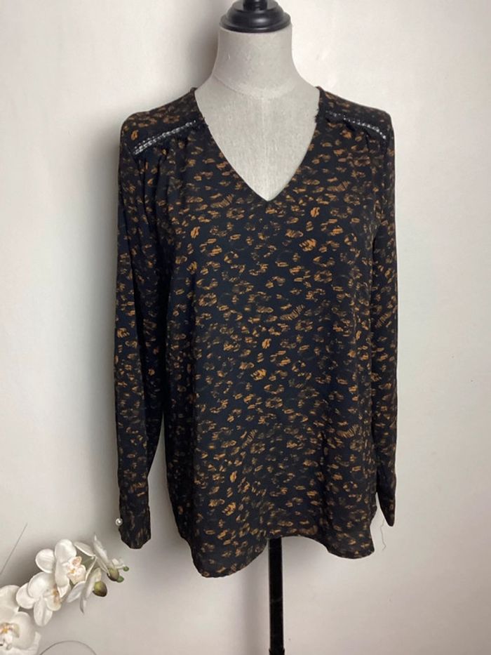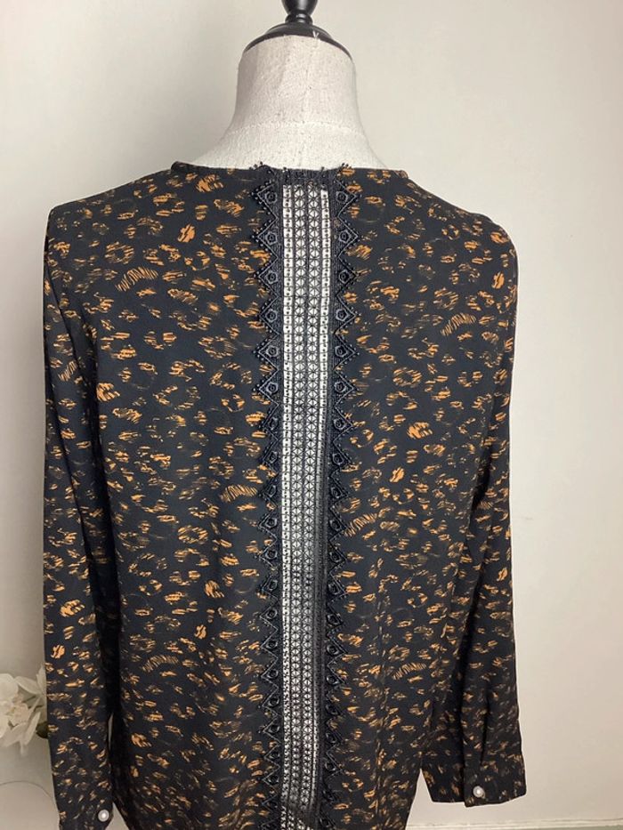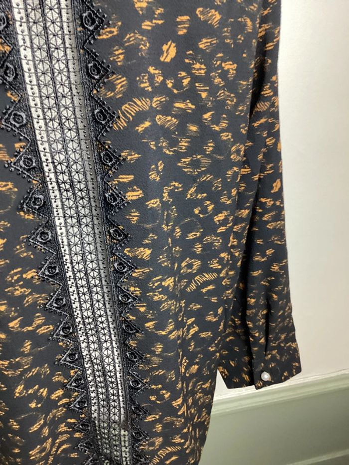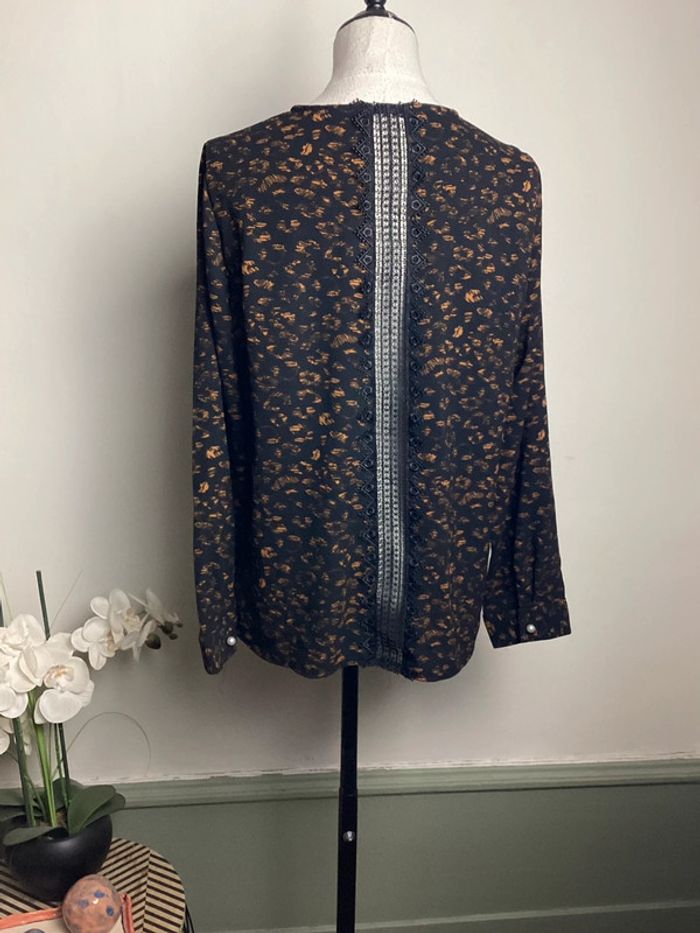Blouse fluide noire à motifs orange Manches longues avec boutons nacrés et broderies dans le dos et aux épaules Largeur d’aisselle à aisselle : 44 cms Longueur totale : 60 cms #blousefemme38 #femme38 #hautfemme38 #blousenoire38 #blouseamotifs38 #blousefluide38 #blouse38 #blouselilietlala38 #lilietlalafemme38 #blousemancheslongues38 #lilietlala38 #haut38 #carole1996 #teametco #blousebrodee38