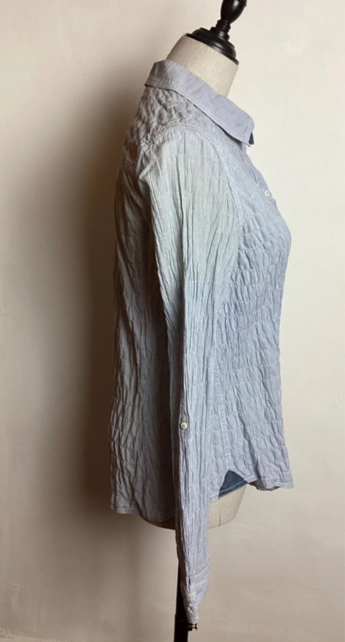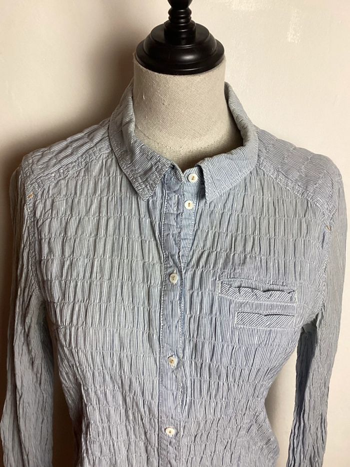 Chemise à fines rayures blanches et bleues claires, effet plissée Longueur totale : 63 cms Largeur d’aisselle à aisselle : 44 cms #bonobofemme40 #femme40 #hautfemme40 #bonobo40 #chemisebonobofemme40 #chemisebonobo40 #chemisefemme40 #chemisebleueetblanche40 #chemise40 #haut40 #carole1996 #teametco
