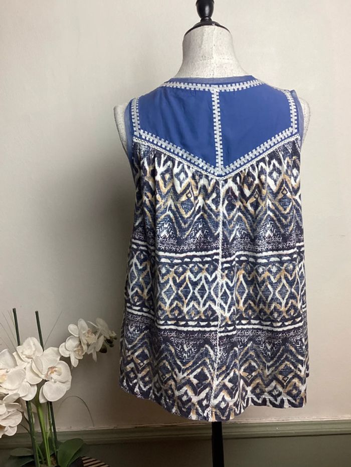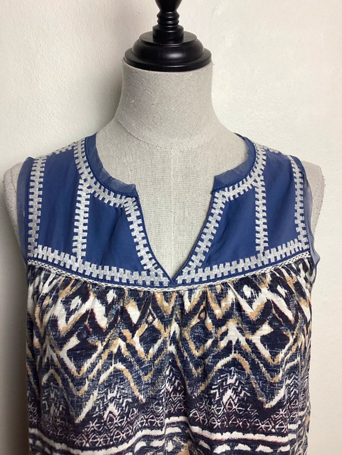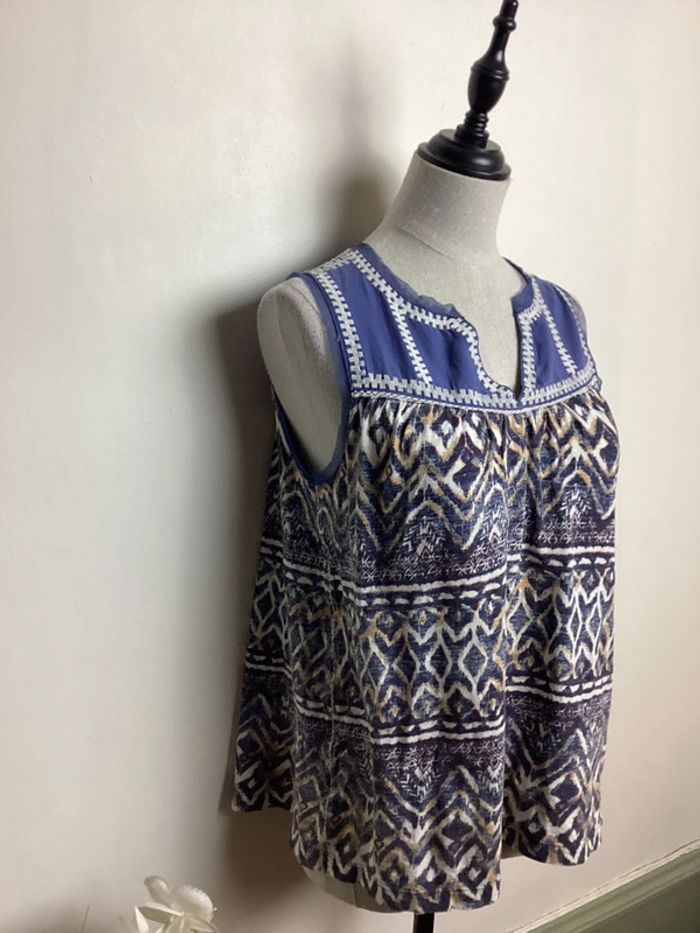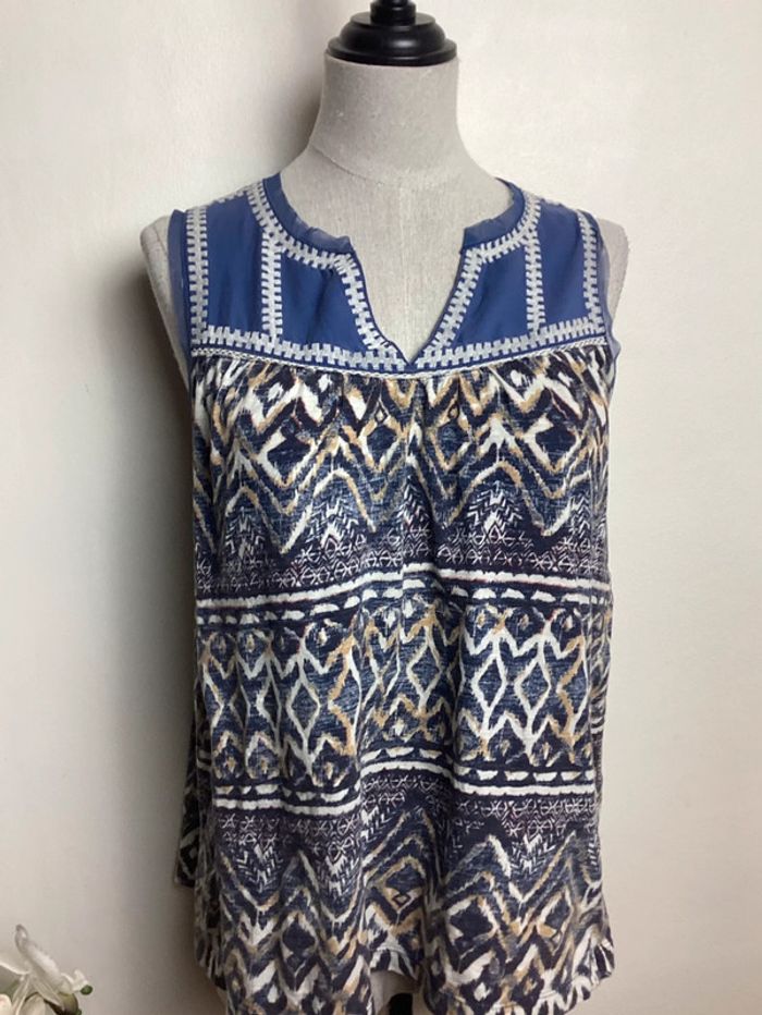 Blouse à motifs bleus, blancs et beiges Broderies sur le haut Longueur totale : 58 cms Largeur d’aisselle à aisselle : 42 cms #blousefemme36 #femme36 #blouse36 #blouseàmotifs36 #hautfemme36 #blousebleueetblanche36 #via2836 #blousevia28 #carole1996 #teametco