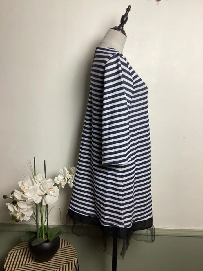 Robe marinière à rayures blanches et marine Manches 3/4 et voilage noir sur le bas Longueur totale : 90 cms Largeur d’aisselle à aisselle : 42 cms #zarafemme36 #femme36hiver #hiverfemme36 #femme36 #robecasual36 #robearayures36 #robe36 #robehiver36 #robemarineetblanche36 #robezara #zara36 #carole1996 #teametco