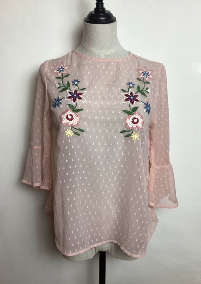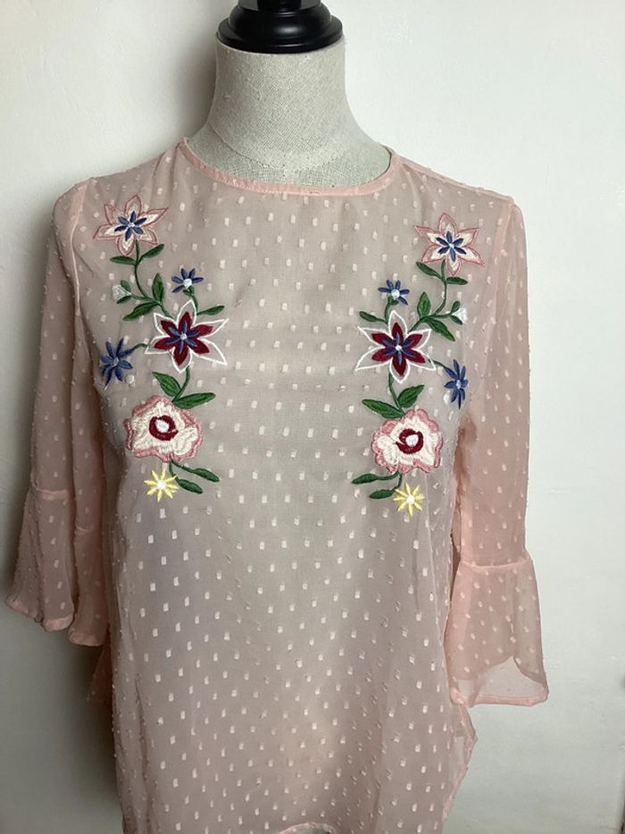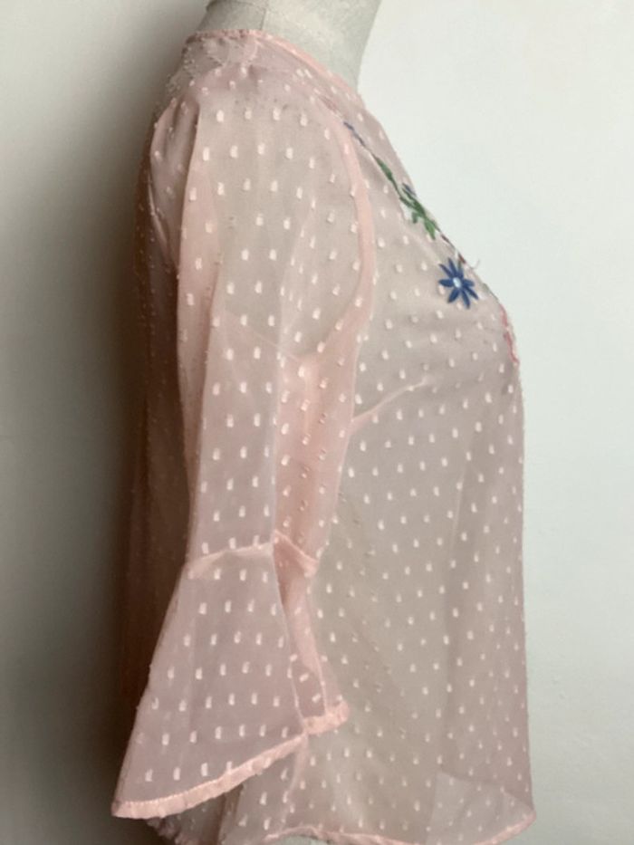 Blouse fluide de couleur rose pâle légèrement transparente Plumetis et fleurs brodées multicolores Manches 3/4 évasées Longueur totale : 58 cms Largeur d’aisselle à aisselle : 44 cms #blouserosepale34 #blouserose34 #hautfemme34 #femme34 #blousefemme34 #blouse34 #blousetransparente34 #atmospherefemme34 #atmosphere34 #blouseatmosphere34 #blousebrodee34 #carole1996 #teametco