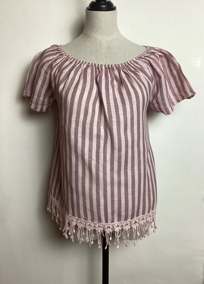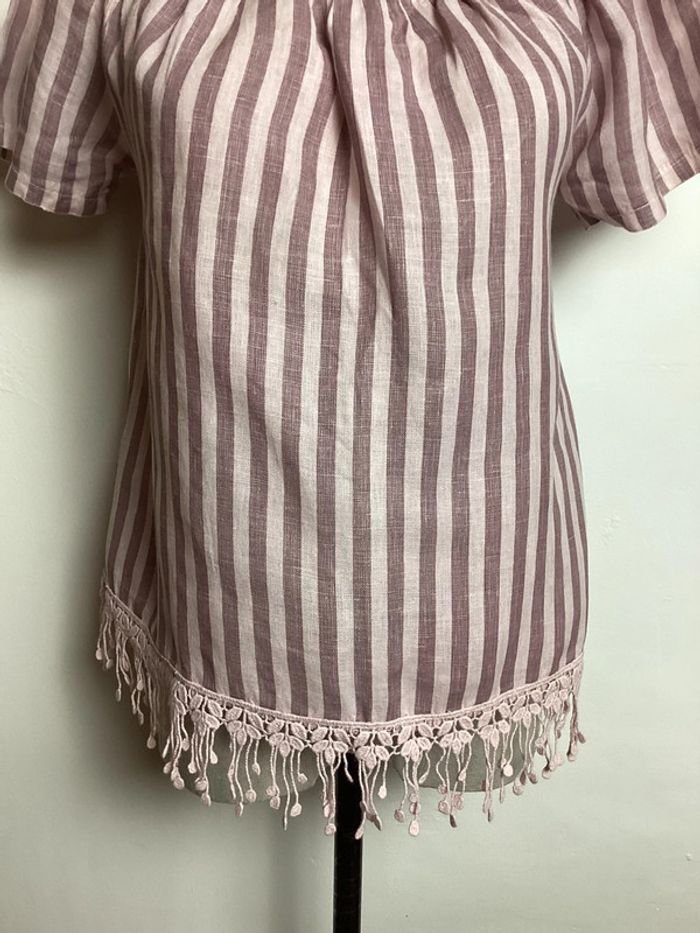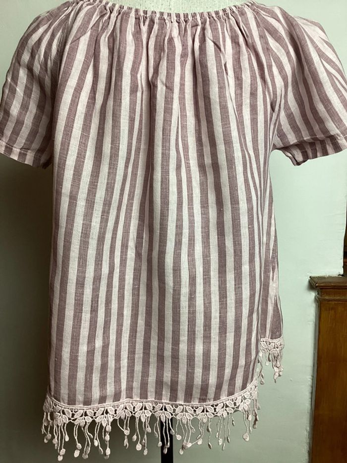 Blouse à rayures roses pâles et parles Élastique au col et broderies sur le bas Largeur d’aisselle à aisselle : 42 cms Longueur totale : 57 cms #blousefemme38 #blouse38 #femme38 #hautfemme38 #blousearayures38 #blouserose38 #madeinitaly38 #blousemadeinitaly38 #carole1996 #teametco