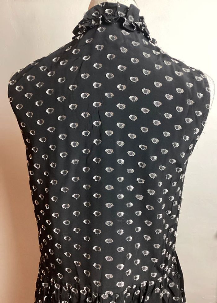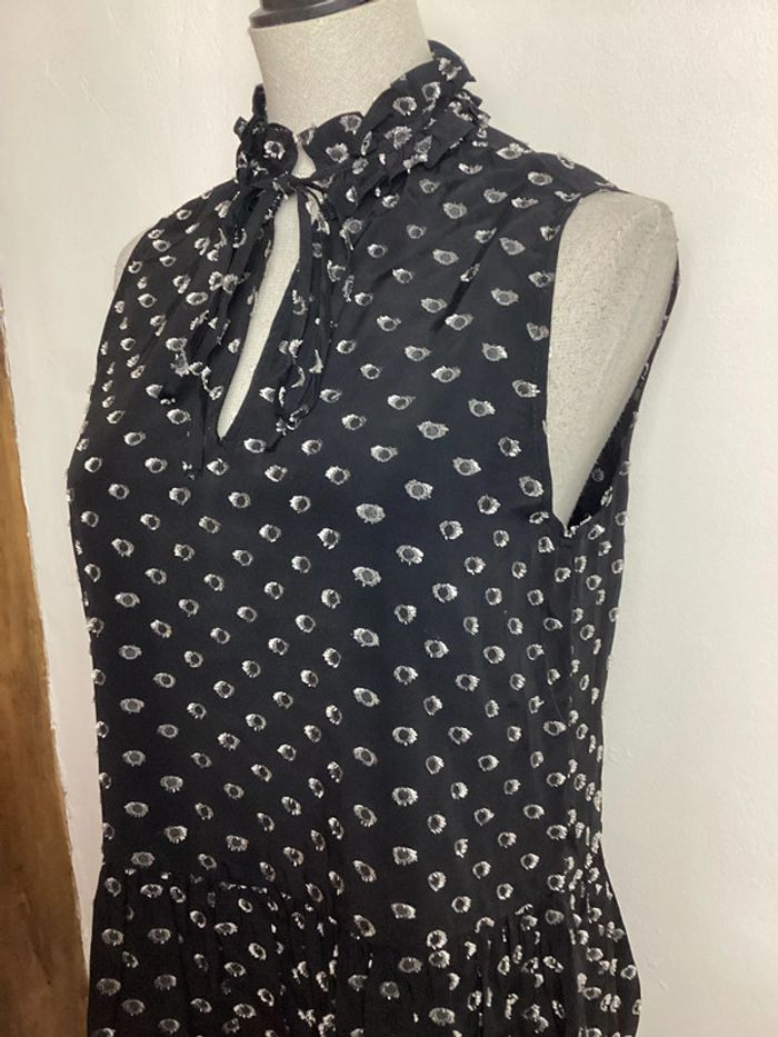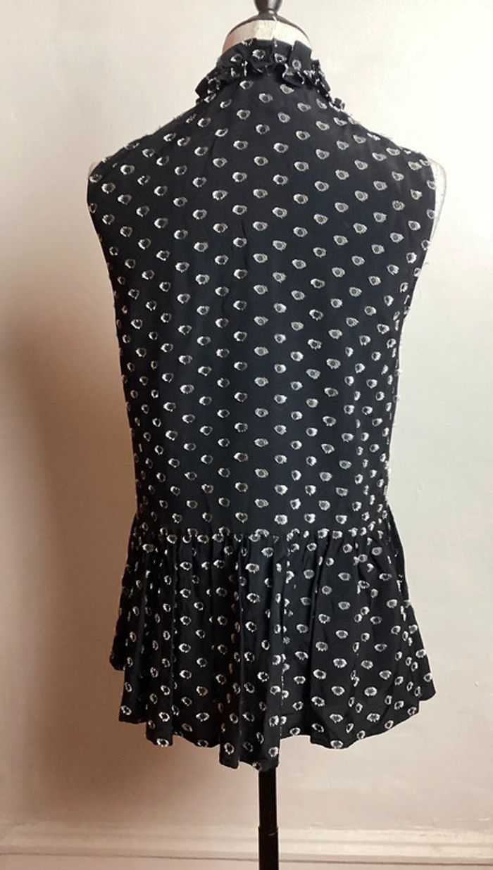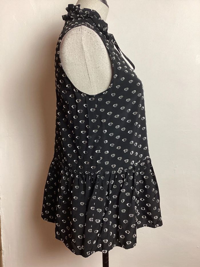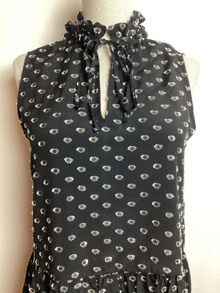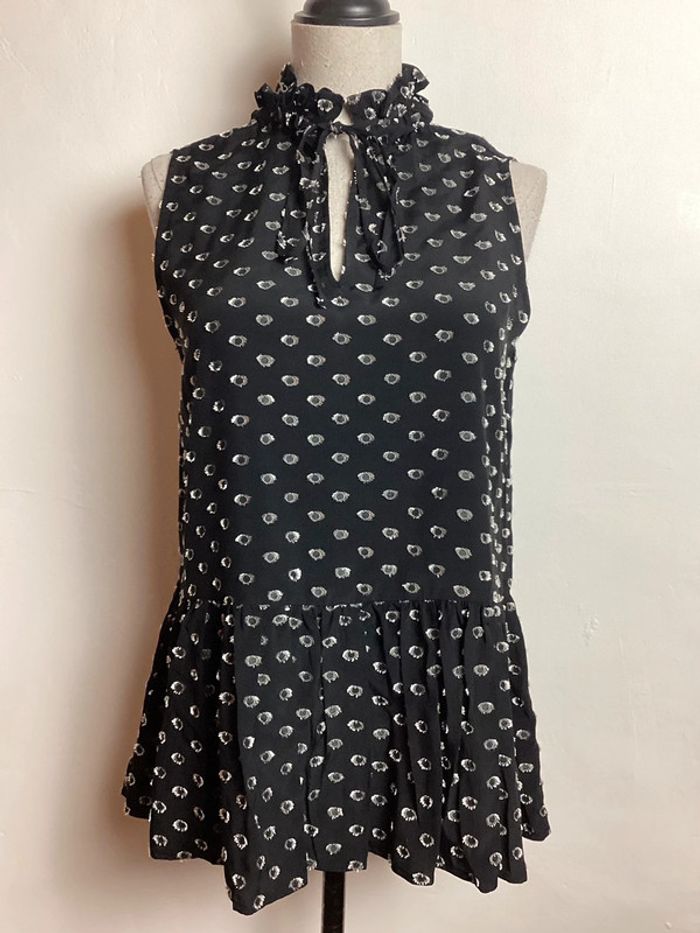 Blouse noire à motifs argentés Décolleté en V avec possibilité de faire un noeud Longueur totale : 62 cms Largeur d’aisselle à aisselle : 44 cms #kookaifemme34 #kookai34 #blousekookai34 #femme34 #hautfemme34 #blousefemme34 #blouse34 #blousenoire34 #carole1996 #teametco