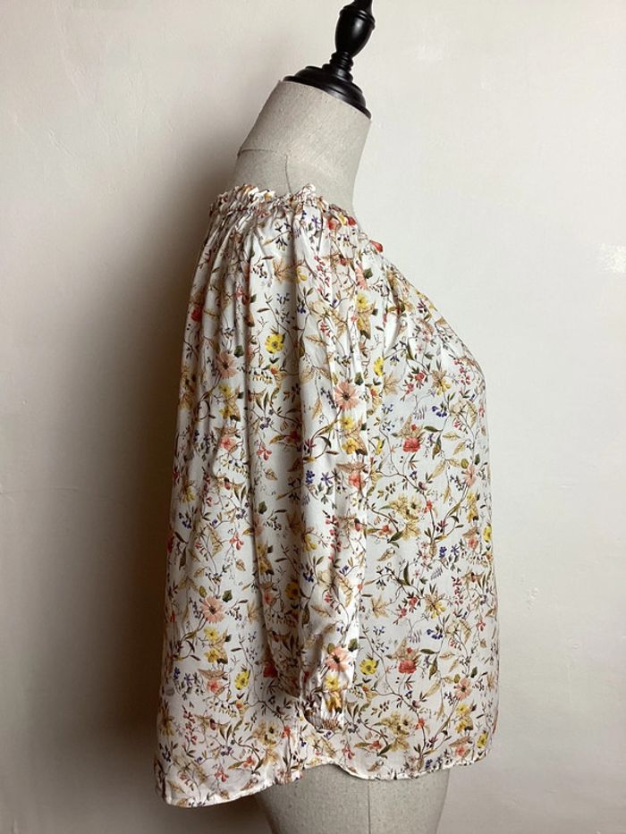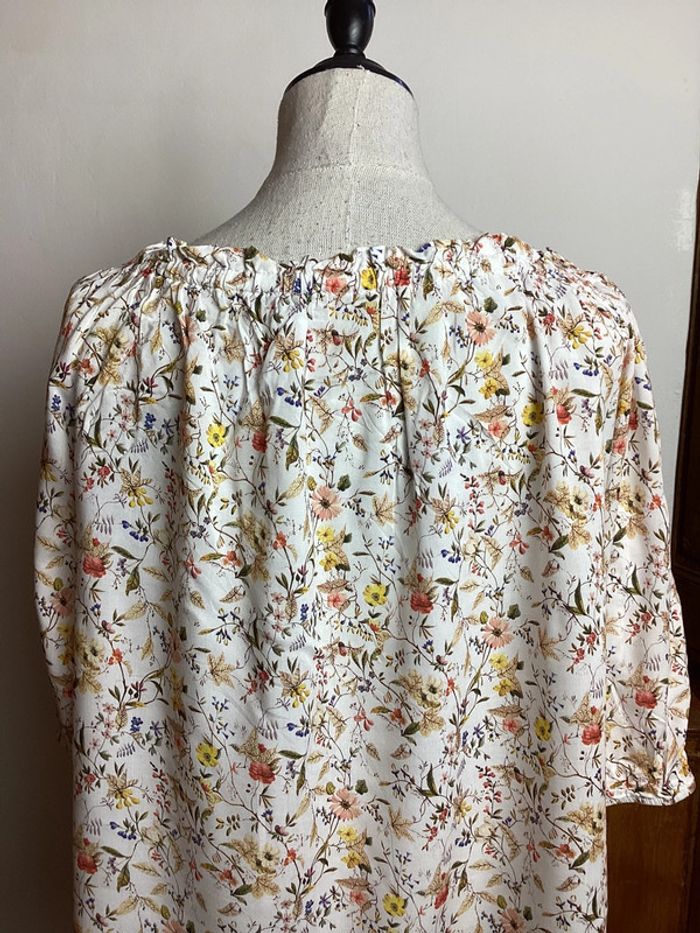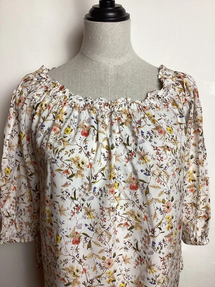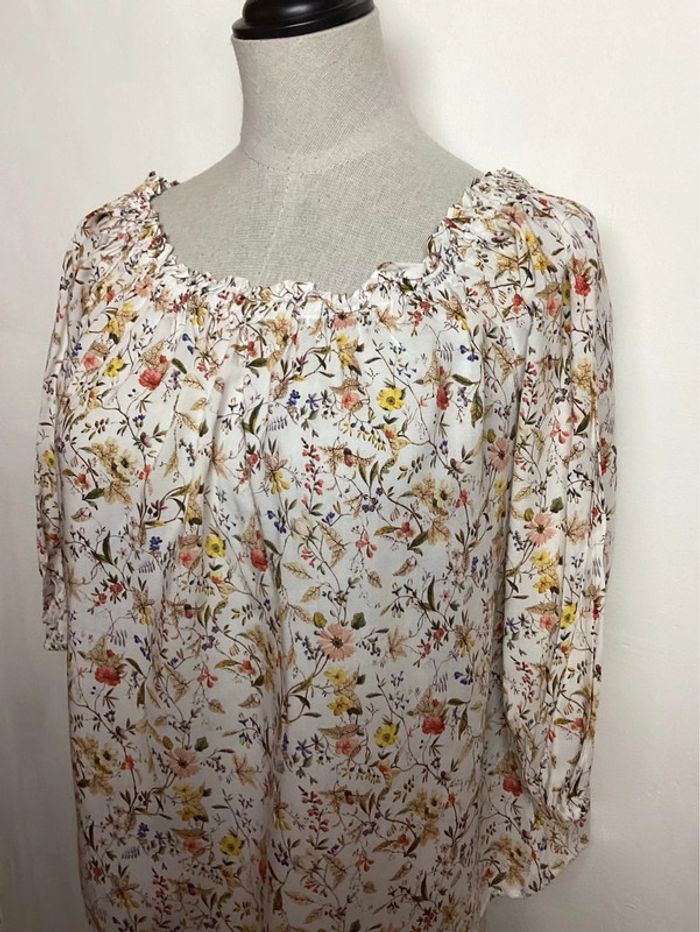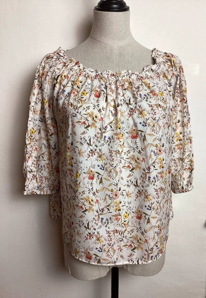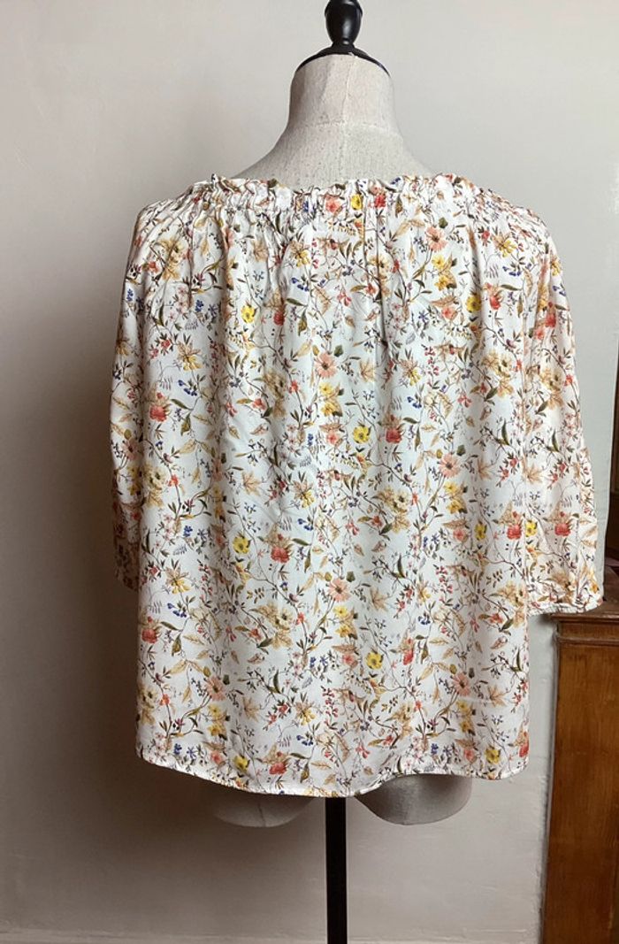Blouse écrue fleurie dans les tons jaune, vert, orange et bleu Manches 3/4, élastique au col qui permet de dénuder les épaules Longueur totale : 48 cms Largeur d’aisselle à aisselle : 46 cms #blousefemme36 #femme36 #hautfemme36 #blousefleurie36 #blousemulticolore36 #blouse36 #carole1996 #teametco