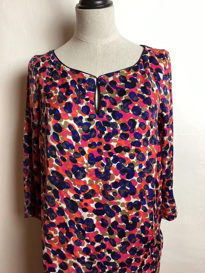Robe à motifs multicolores dans les tons rose, orange, bleu et beige kaki Manches 3/4, fermeture éclair dans le dos et petite ouverture sur le devant #kookaifemme34 #robekookai34 #kookaifemme34 #femme34 #robefemme34 #robecasual34 #robemulticolore34 #robeamotifs34 #femme34hiver #hiverfemme34 ##robehiver34 #robe34 #carole1996 #teametco