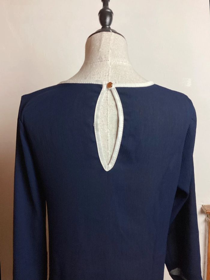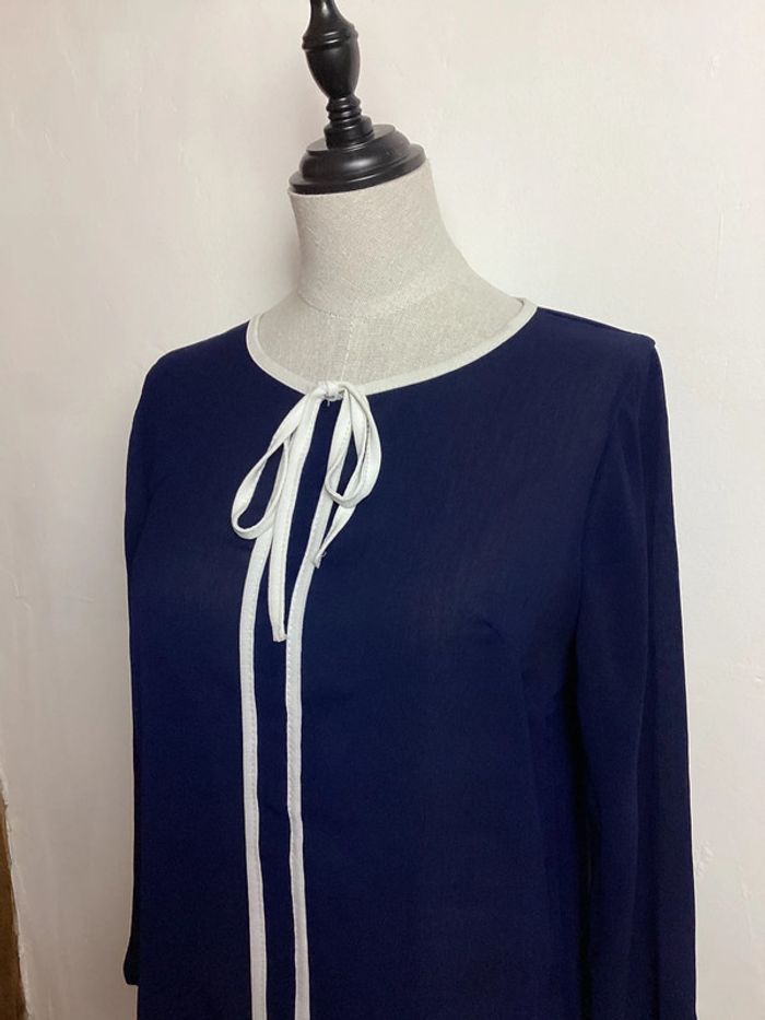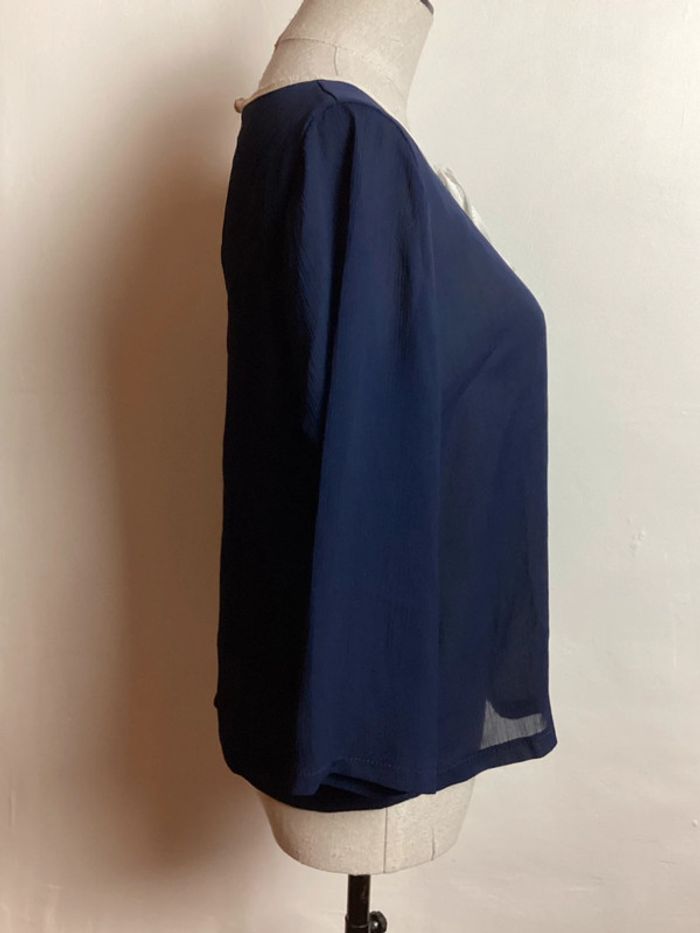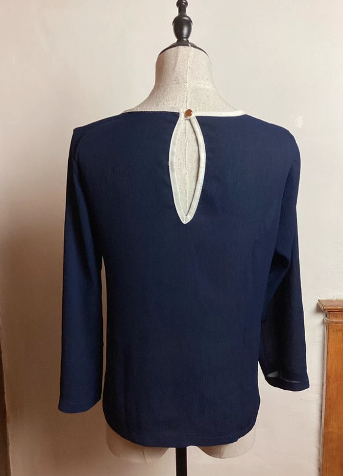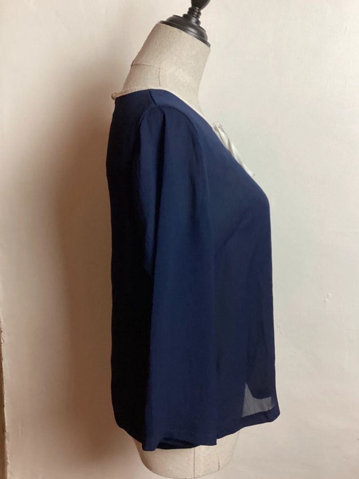 Blouse marine avec noeud et liseré blanc Manches 3/4 Longueur totale : 56 cms Largeur d’aisselle à aisselle : 44 cms #blousefemme36 #hautfemme36 #femme36 #blousemarine36 #blousehiver36 #femme36hiver #hiverfemme36 #blousemarineetblanche36 #blousefluide36 #carole1996 #teametco