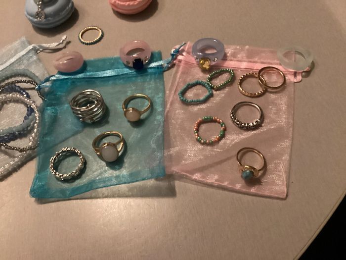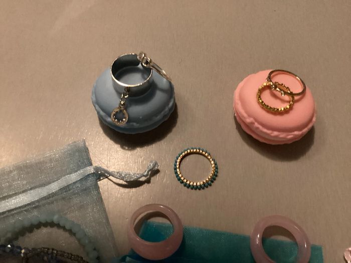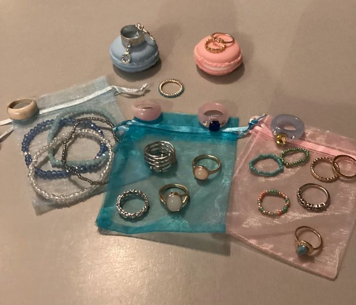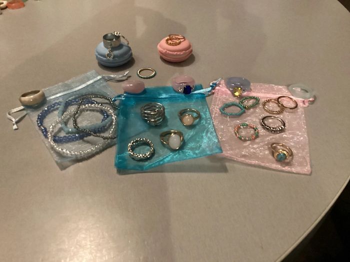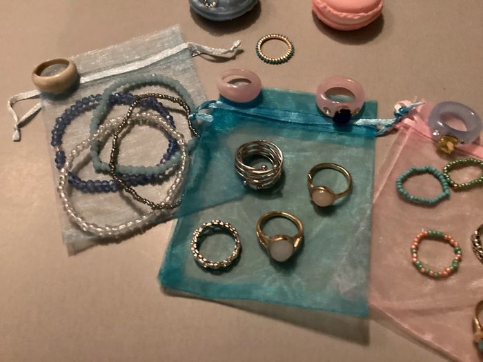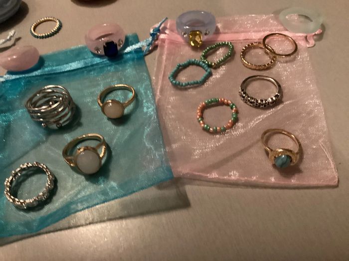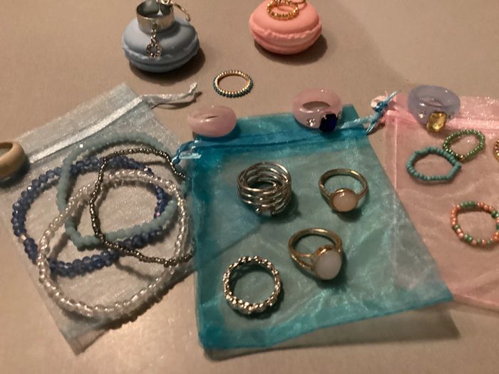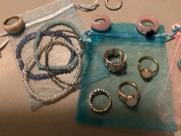 Lot de bijoux: - 4 bracelets - 3 bagues perles - 6 bagues argentées - 8 bagues dorées - 5 bagues de couleur Offert 3 pochons et 2 étuis pour bagues Différents diamètres ##lotdebijoux #bijouxfantaisie #bijouxfantaisiefemme #lotdebijouxfantaisie #lotdebijouxfantaisiefemme #baguesfemme #braceletsfemme #carole1996 #teametco #braceletsperles #baguesperles #baguesargentées #baguesdorées