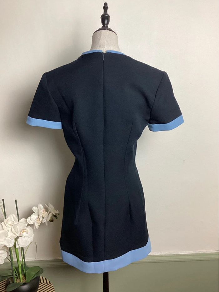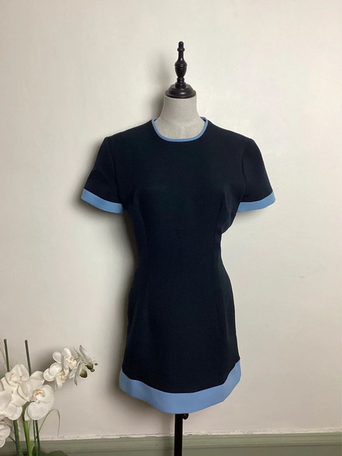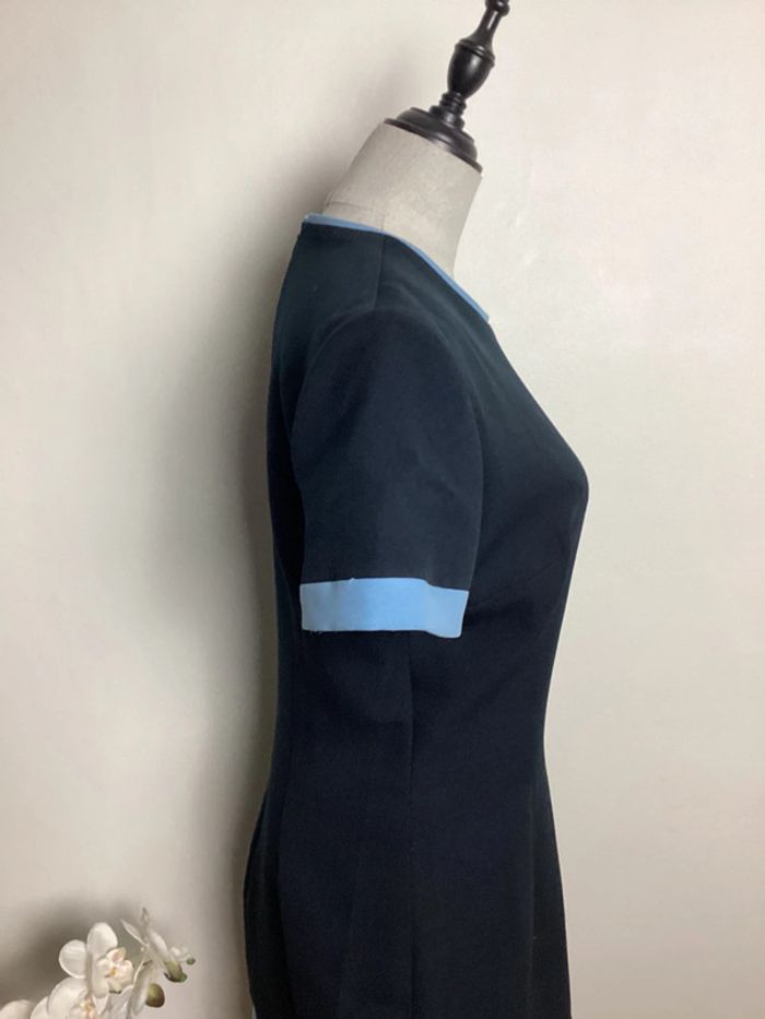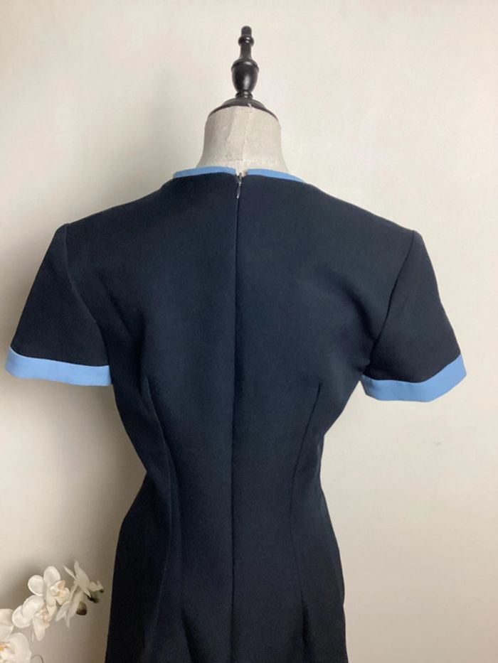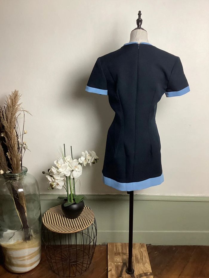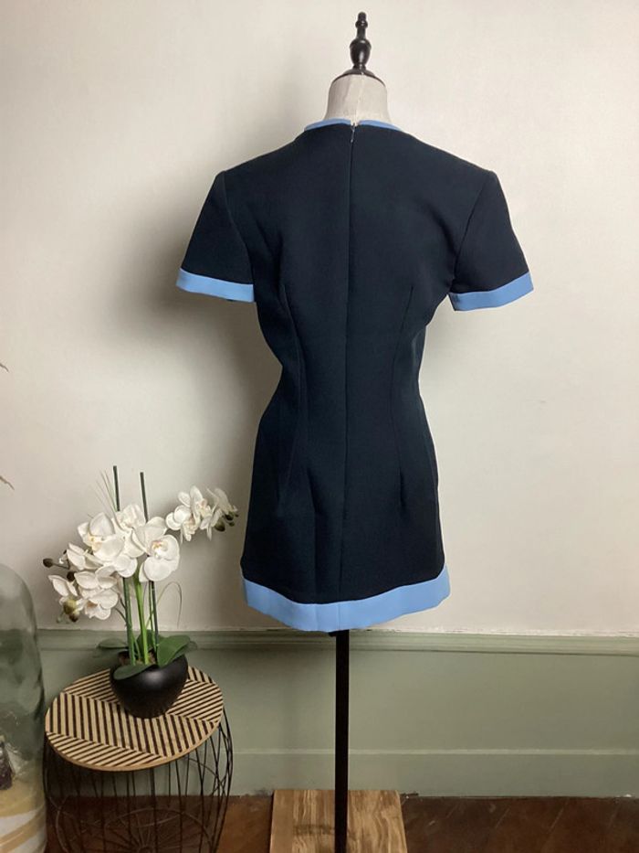 Robe marine avec liserés bleu ciel Fermeture éclair dans le dos, cintrée à la taille Longueur totale : 80 cms Largeur d’aisselle à aisselle : 45 cms #robecasual38 #femme38 #robemarine38 #robehiver38 #femme38hiver #hiverfemme38 #robe38 #carole1996 #teametco