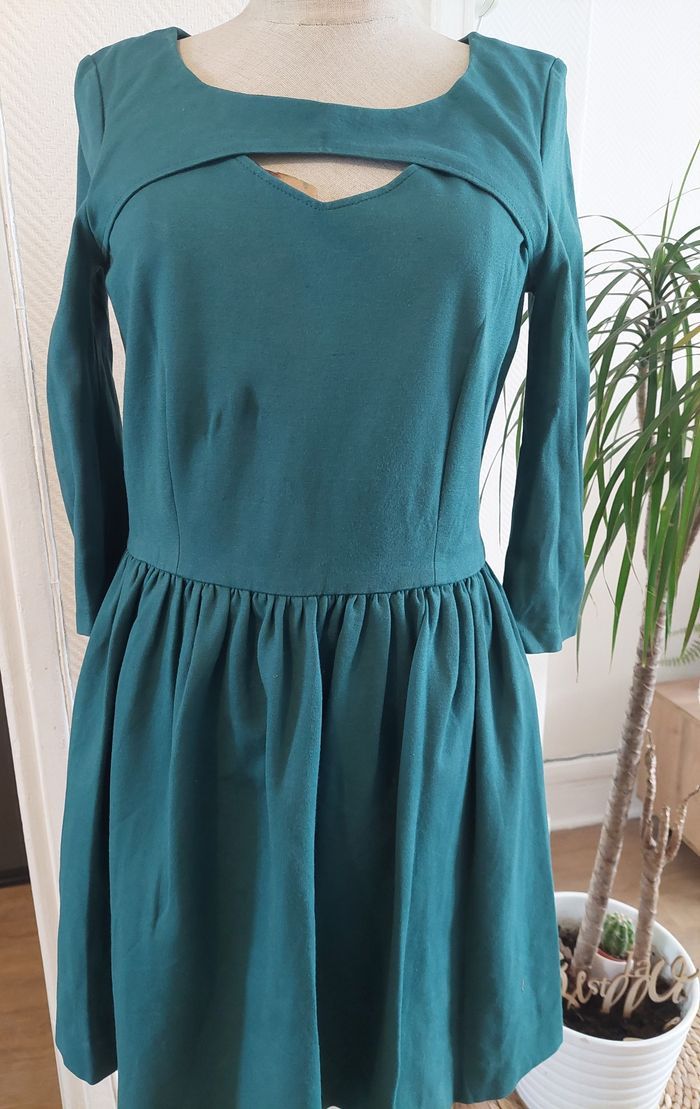 Robe patineuse avec quelques détails à l'encolure, manches trois-quarts, taille 38, en matière stretch, très agréable à porter."