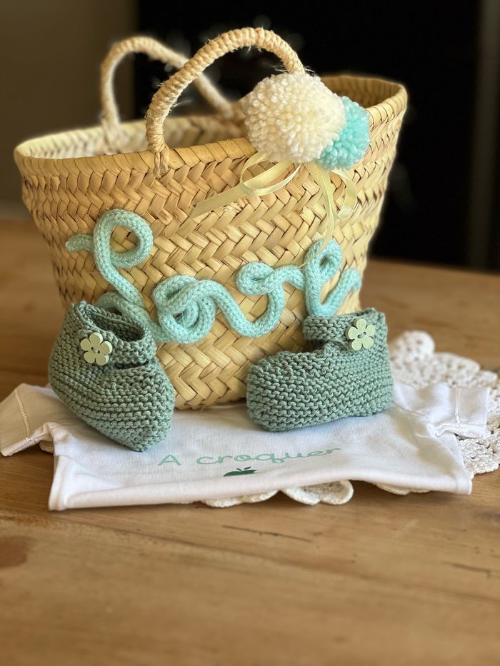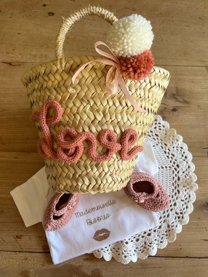 Panier en raphia naturel , anses en corde à la décoration en tricotin du mot love Les bodies et chaussons des photos sont disponibles également à la vente