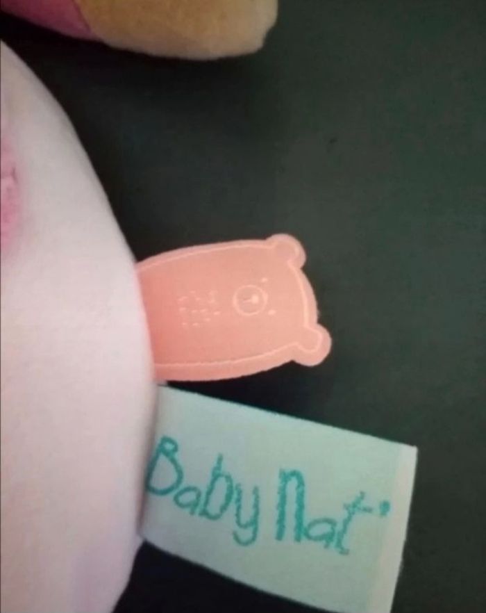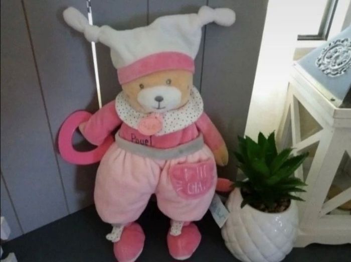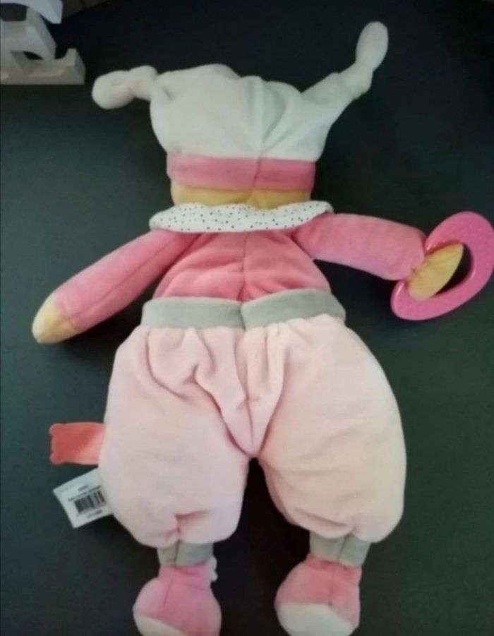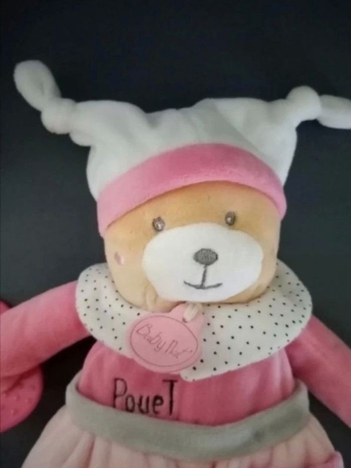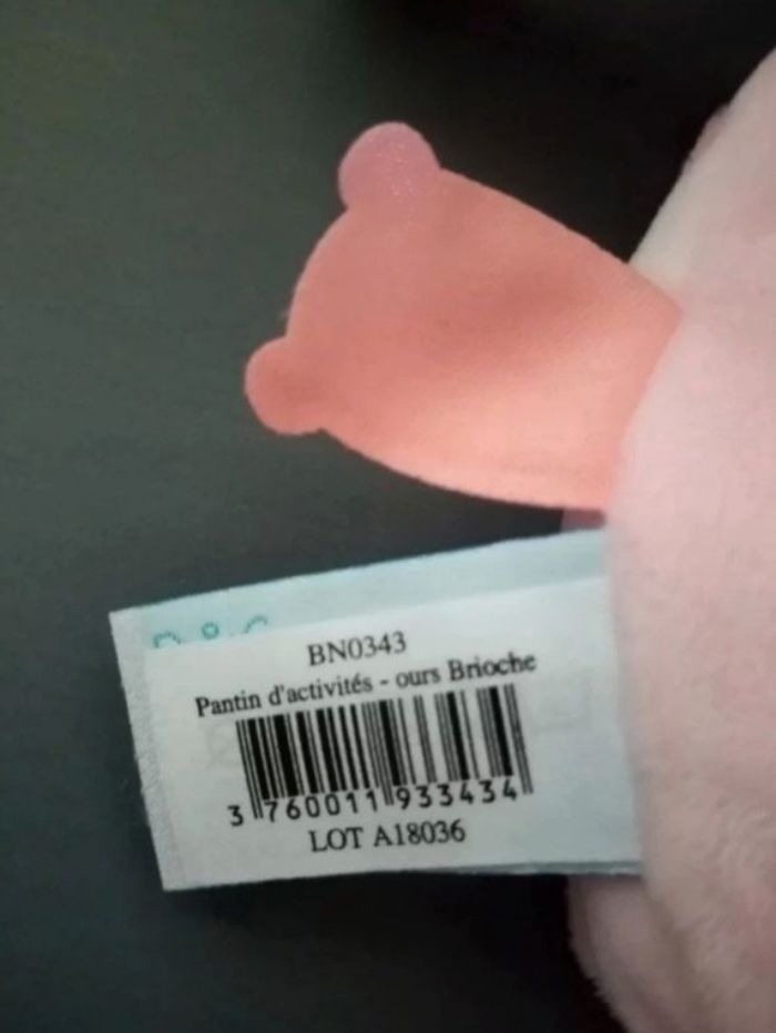 Doudou ours pantin d'activités, tons rose, gris et blanc baby nat Brioche, collection Brioche et Polochon, état neuf Réf BN0343