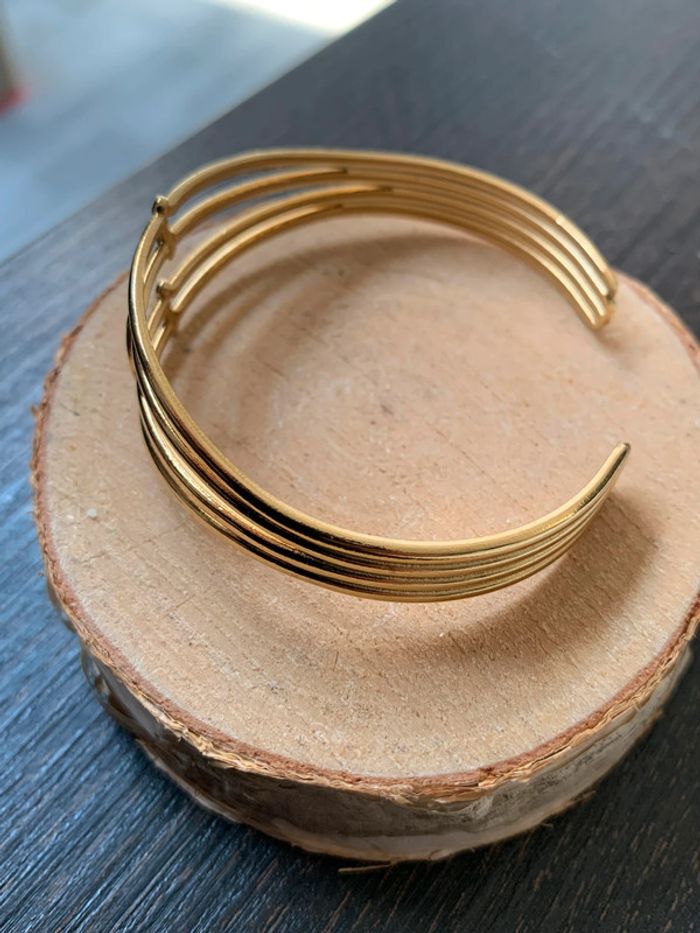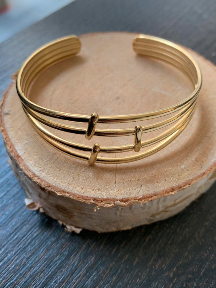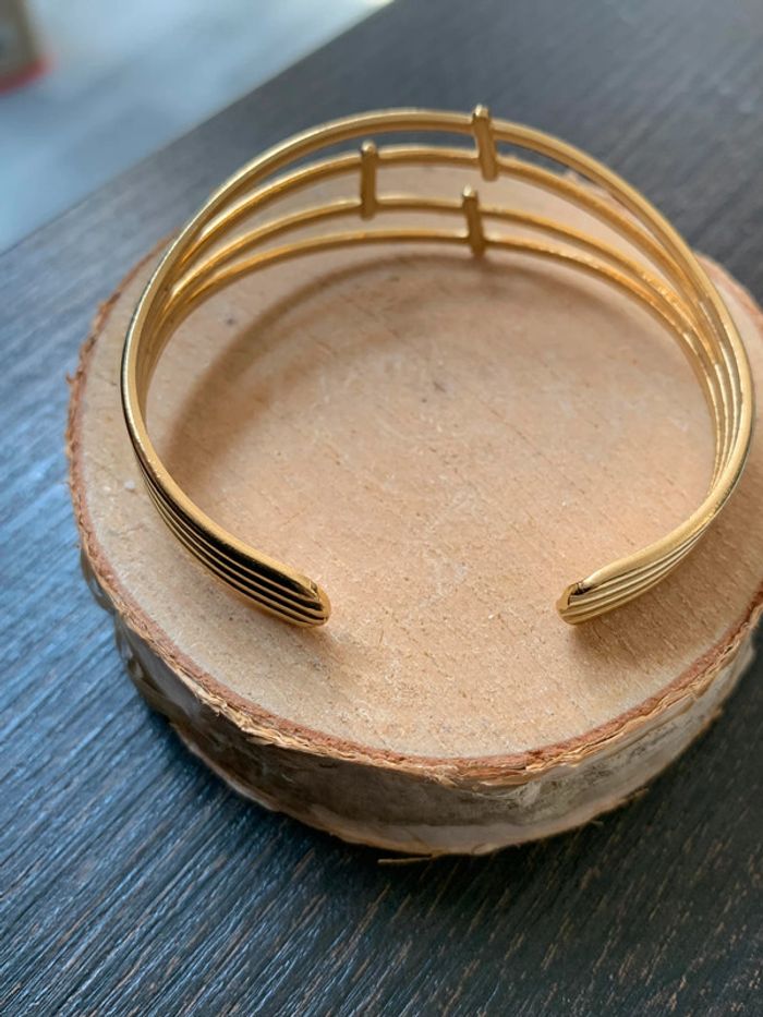 Bracelet ouvert en acier inoxydable. Couleur : Dorée. Vous souhaitez acheter en lot ? veuillez m'envoyer un message et je vous ferez une vente. Envoi rapide et soigné.