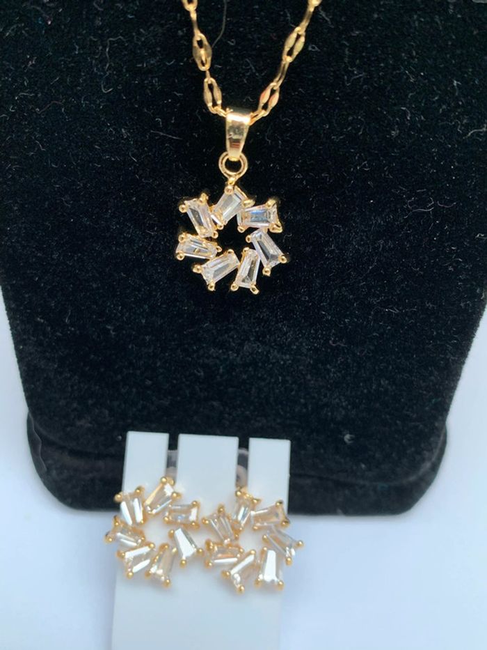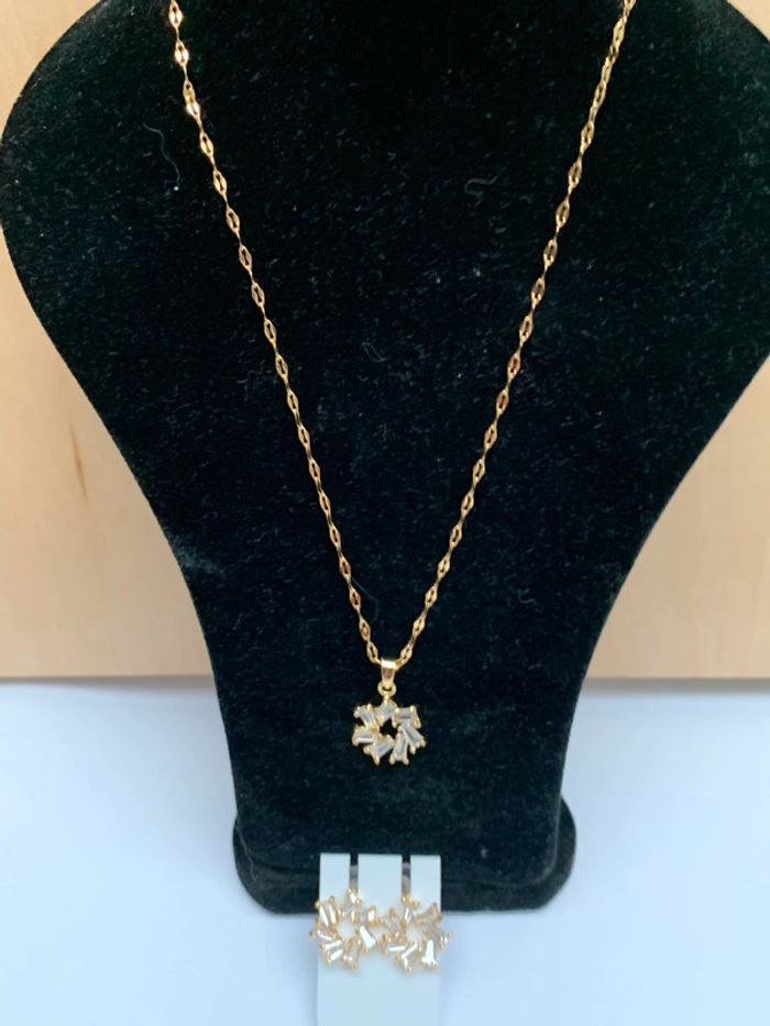 Parure, chaîne fine avec son pendentif et ces boucles d'oreilles en acier inoxydable. Couleur doré, doré/blanc. 45cm. Vous souhaitez acheter un lot ? me contacter, achat en lot = remise. Envoi rapide et soigné.