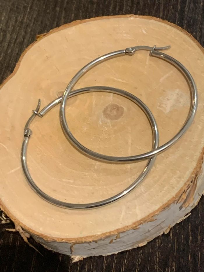 Boucles d'oreilles créole en acier inoxydable. Couleur argenté. Taille: 4.5 cm Achat en lot = remise.