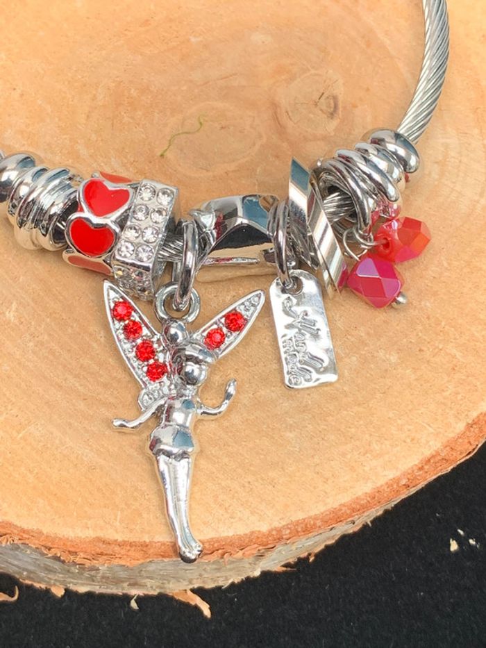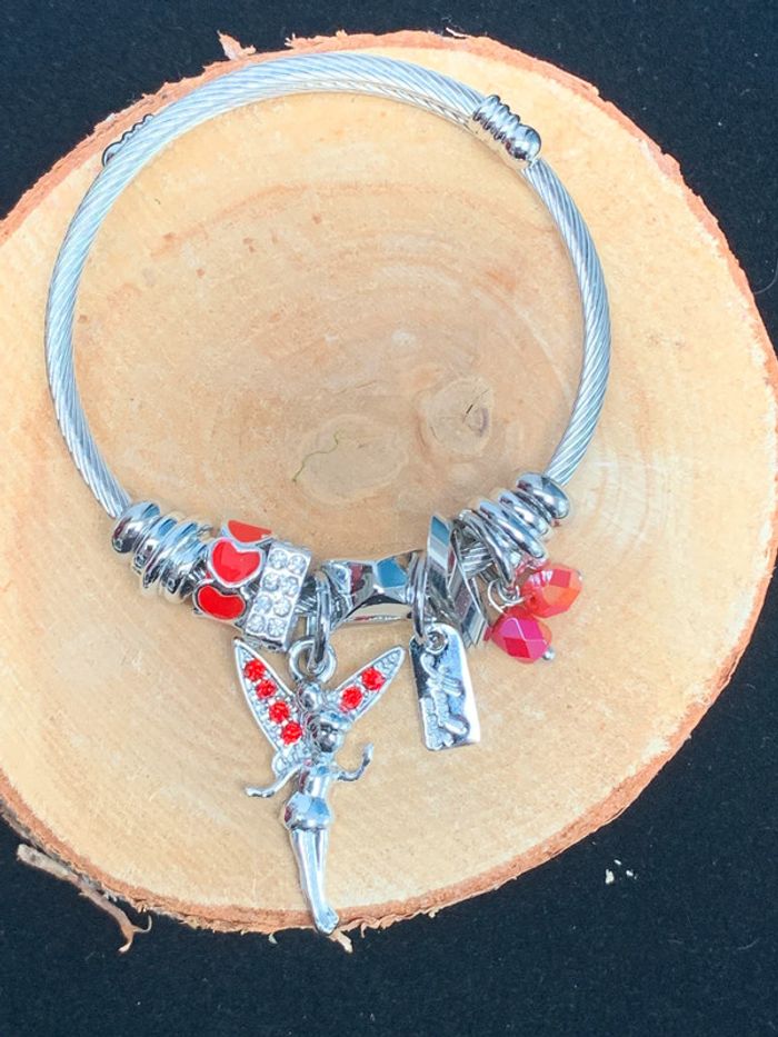 Bracelet jonc en acier inoxydable. Charms: Fée, palette, pierre. Couleur argenté/rouge. Vous souhaitez acheter en lot ? veuillez m'envoyer un message et je vous ferez une vente. Envoi rapide et soigné.