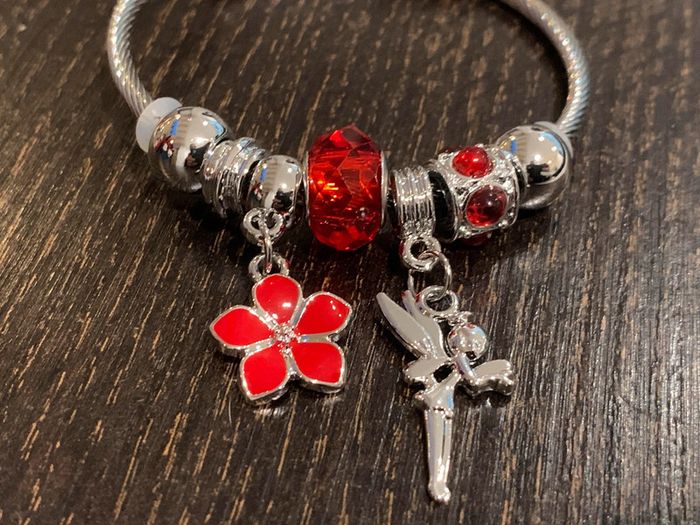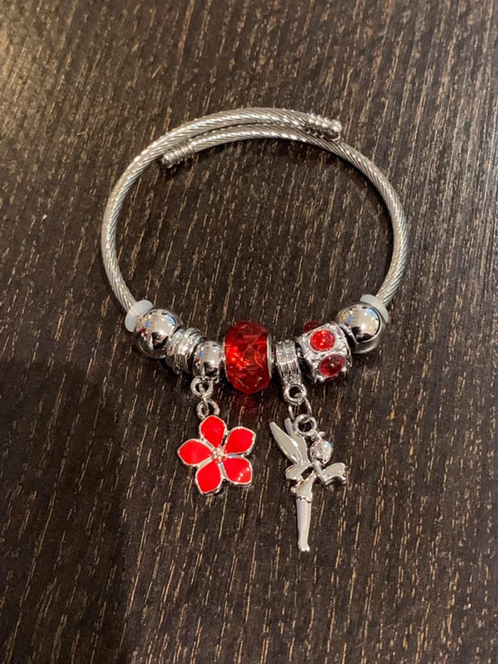 Bracelet jonc en acier inoxydable. Charms: fée, fleur. Couleur argenté rouge. Vous souhaitez acheter en lot ? veuillez m'envoyer un message et je vous ferez une vente. Envoi rapide et soigné.