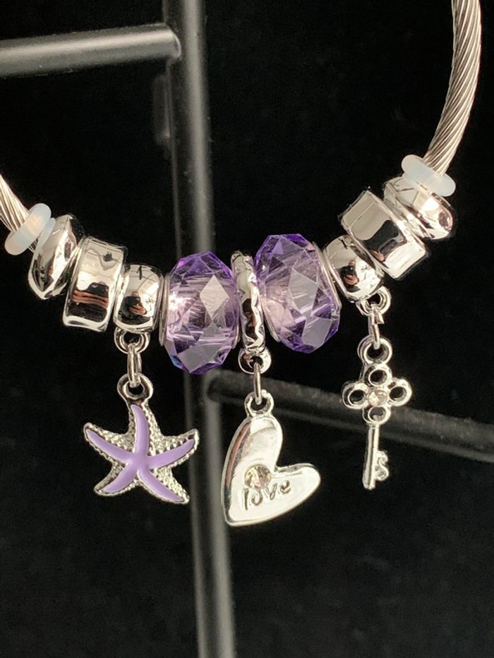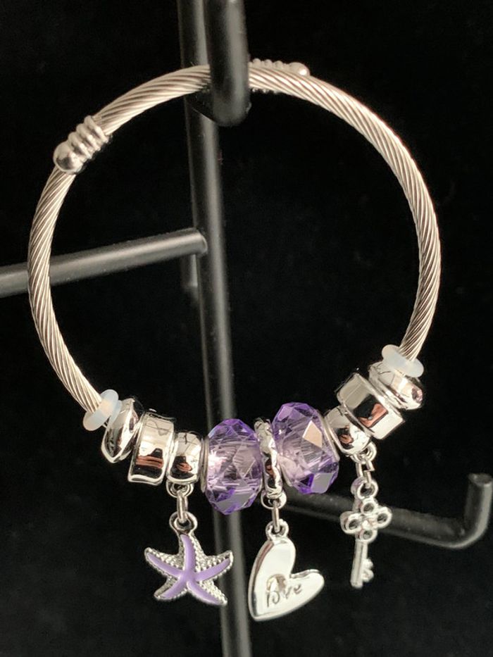 Bracelet jonc en acier inoxydable. Charms étoile de mer, cœur, clef. Couleur argenté/mauve. Vous souhaitez acheter en lot ? veuillez m'envoyer un message et je vous ferez une vente. Envoi rapide et soigné.