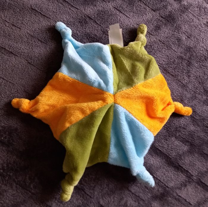 Doudou plat en forme d étoile et en velours de couleurs orange ,vert et bleue Vache sur le milieu du doudou Nœud sur chaque coin du doudou Écriture brodées sur le doudou " doudou tout doux "