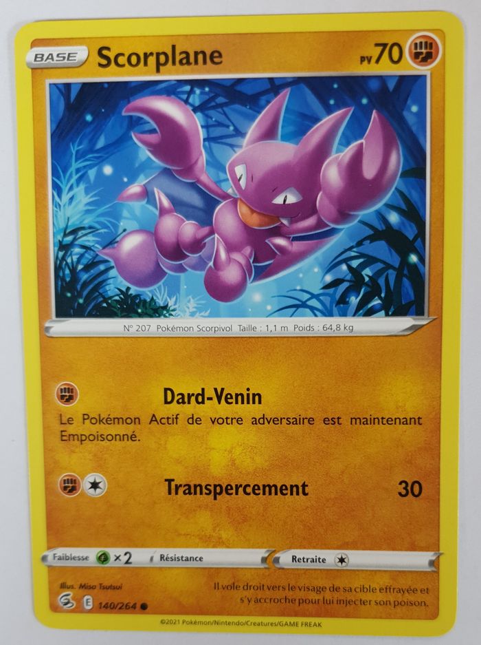 CARTE POKEMON SCORPLANE Etat: Carte en bon état (voir photos, zoomer pour bien voir). Série: Poing de Fusion - EB08 (Epée et Bouclier 8). Numéro: 140/264 ● La carte est envoyé sous sleeve par lettre bien protégée.