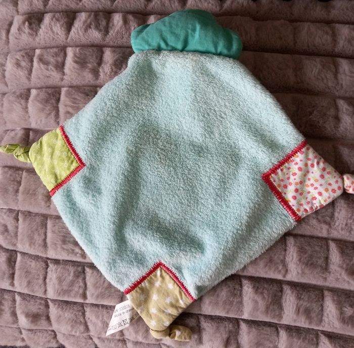 Doudou plat losange en velours de couleur bleu et sur les coins en tissu de différentes couleurs et différents motifs Coussin en tissu rembourré avec imprimé Sophie La Girafe et ourson sur le haut du doudou Pattes de la Girafe sur le doudou Motifs oiseau et écriture " Sophie La Girafe brodées sur le doudou 3 nœuds