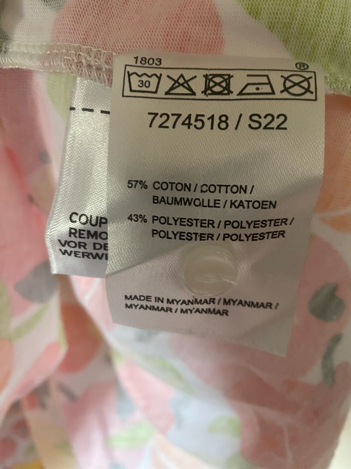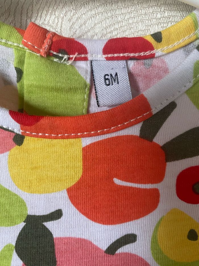Ensemble neuf robe fond blanc imprimé fruits multicolores et son bandeau rouge Taille 6 mois Tissus comme les t-shirt 57% coton 43% polyester