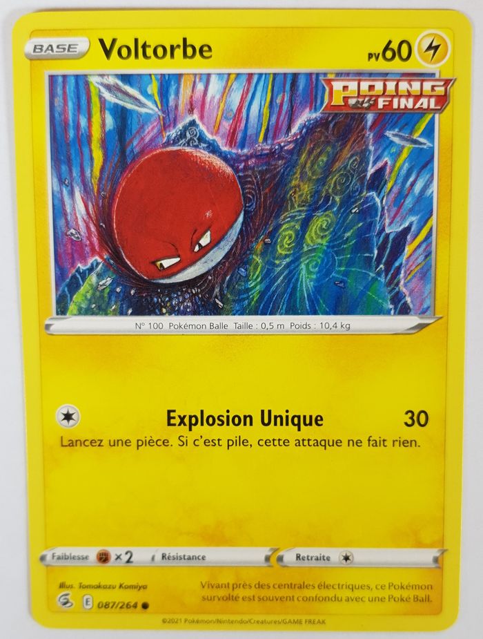 CARTE POKEMON VOLTORBE Etat: Carte en bon état (voir photos, zoomer pour bien voir). Série: Poing de Fusion - EB08 (Epée et Bouclier 8). Numéro: 087/264 ● La carte est envoyé sous sleeve par lettre bien protégée.